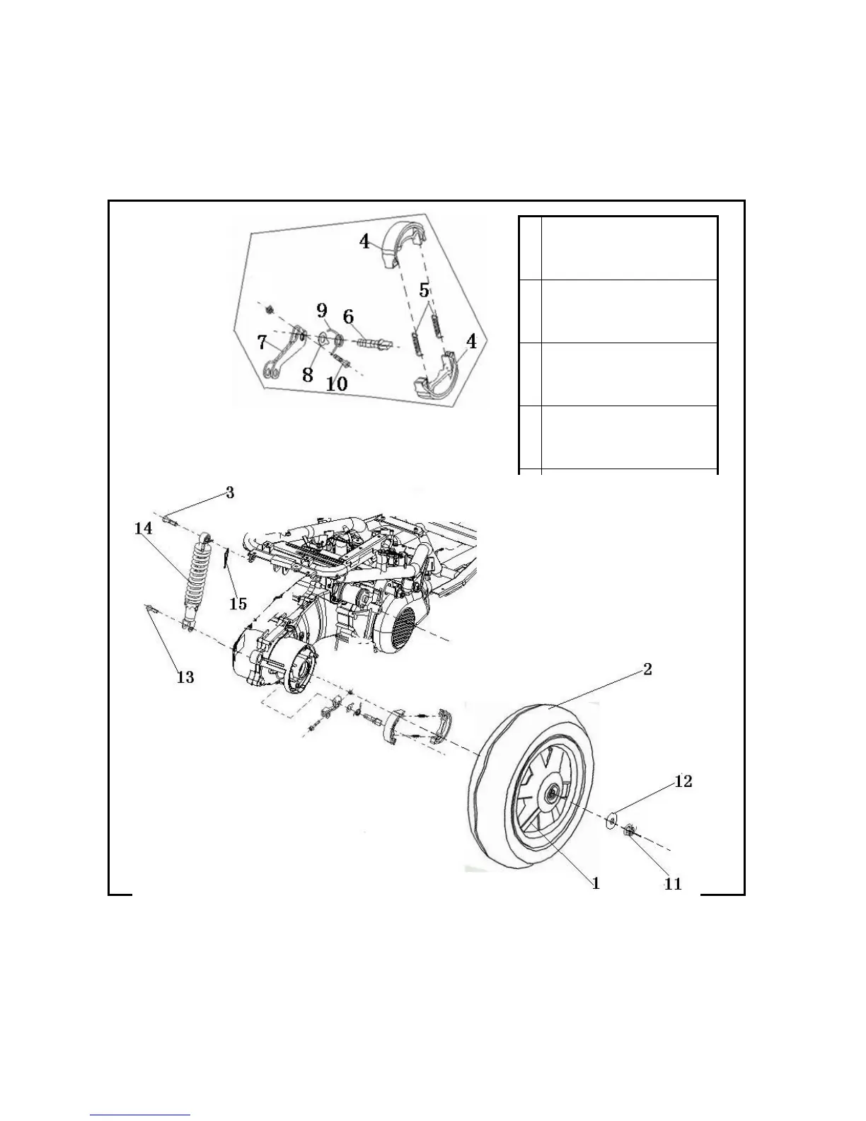 return spring of rear brake 10 mounting bolts of rear crank 11 bolts 12 dust proof lid 13 screw M8×31