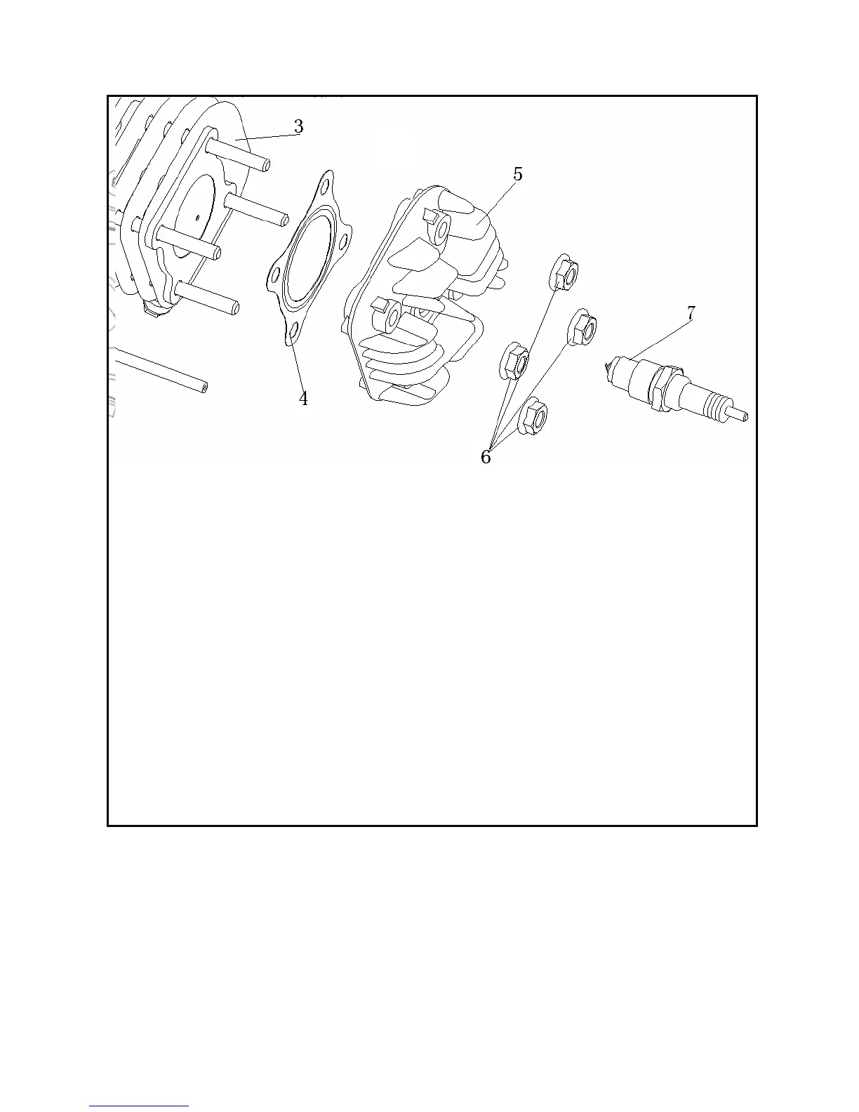 1. Piston 2. Piston pin. 3. Cylinder block. 4. Cylinder gasket. 5. Cylinder head. 6. Nut. 7. Spark plug