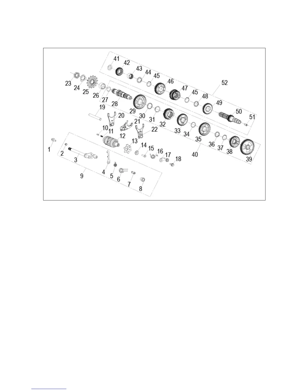 gear 47 Spindle third and fourth gear 48 Spline pad 49 Spindle fifth gear 50 Spindle 51 spindle sleeve