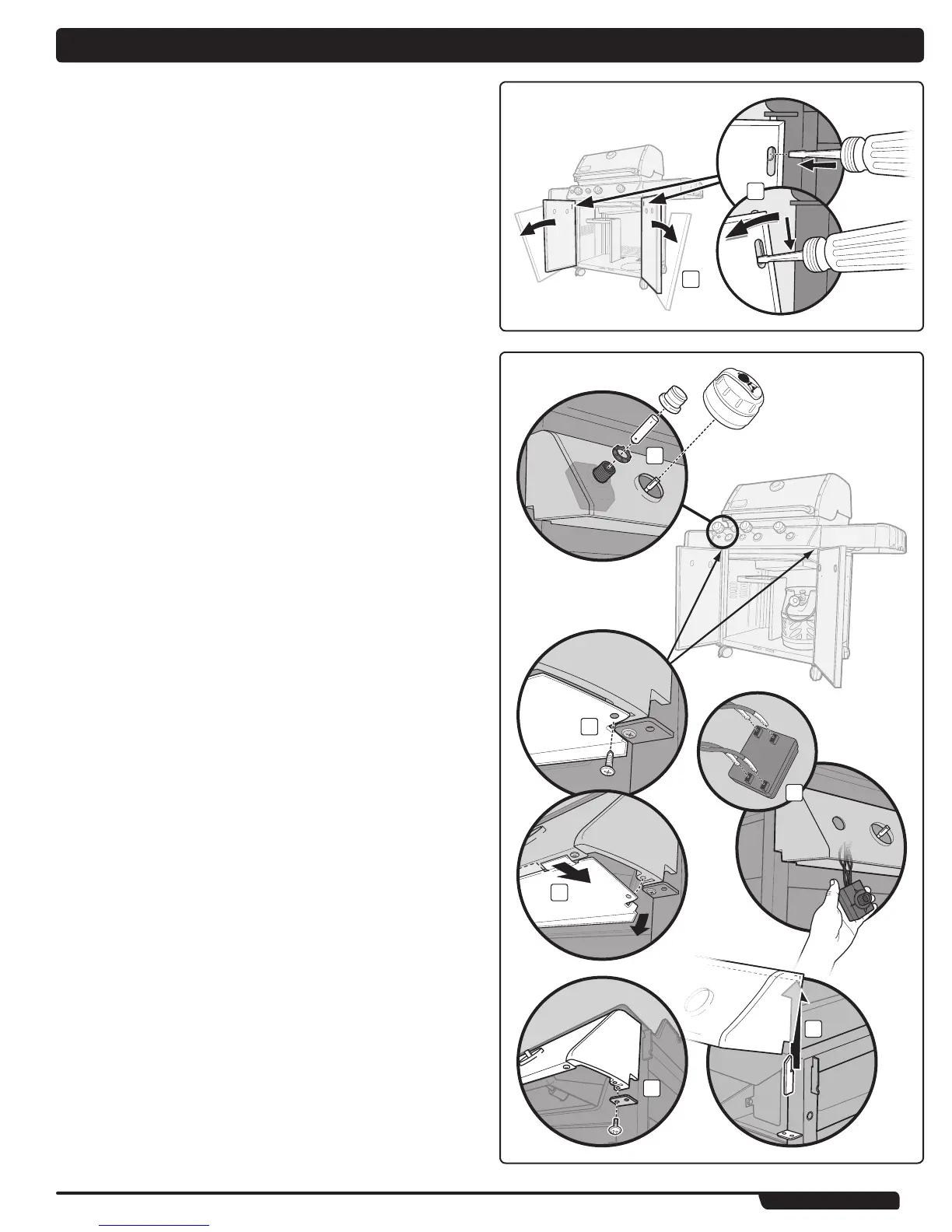 B) Remove control knobs, igniter button, igniter retention nut, and battery (3).
