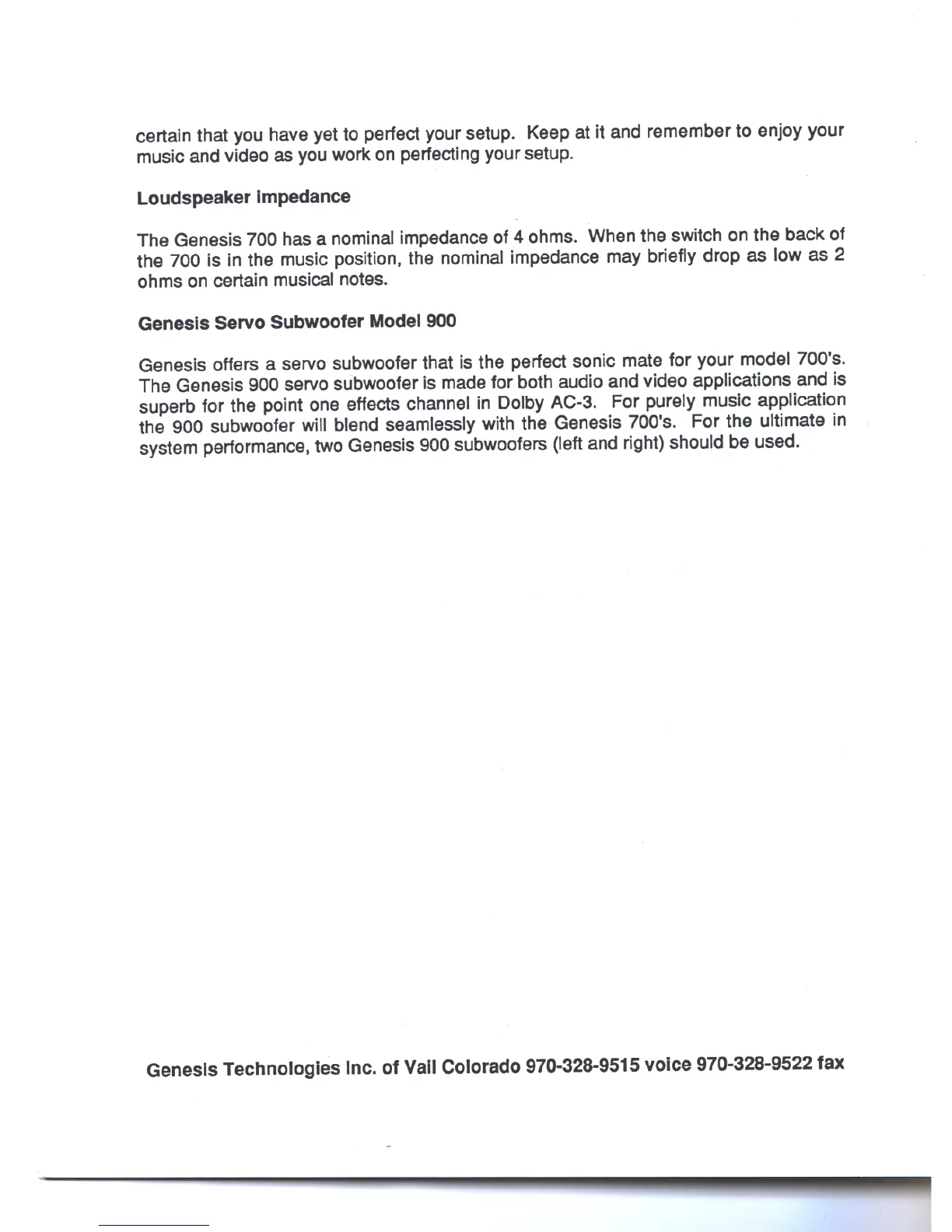 Genesys 700 - Technical Specifications and Accessories; Loudspeaker impedance; Genesis Servo Subwoofer Model 900