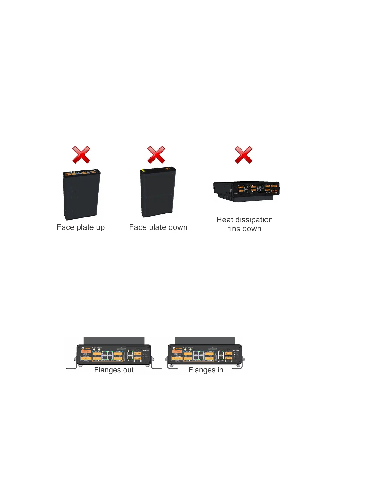 • The standard horizontal mounting brackets can be installed with the mounting flanges pointing