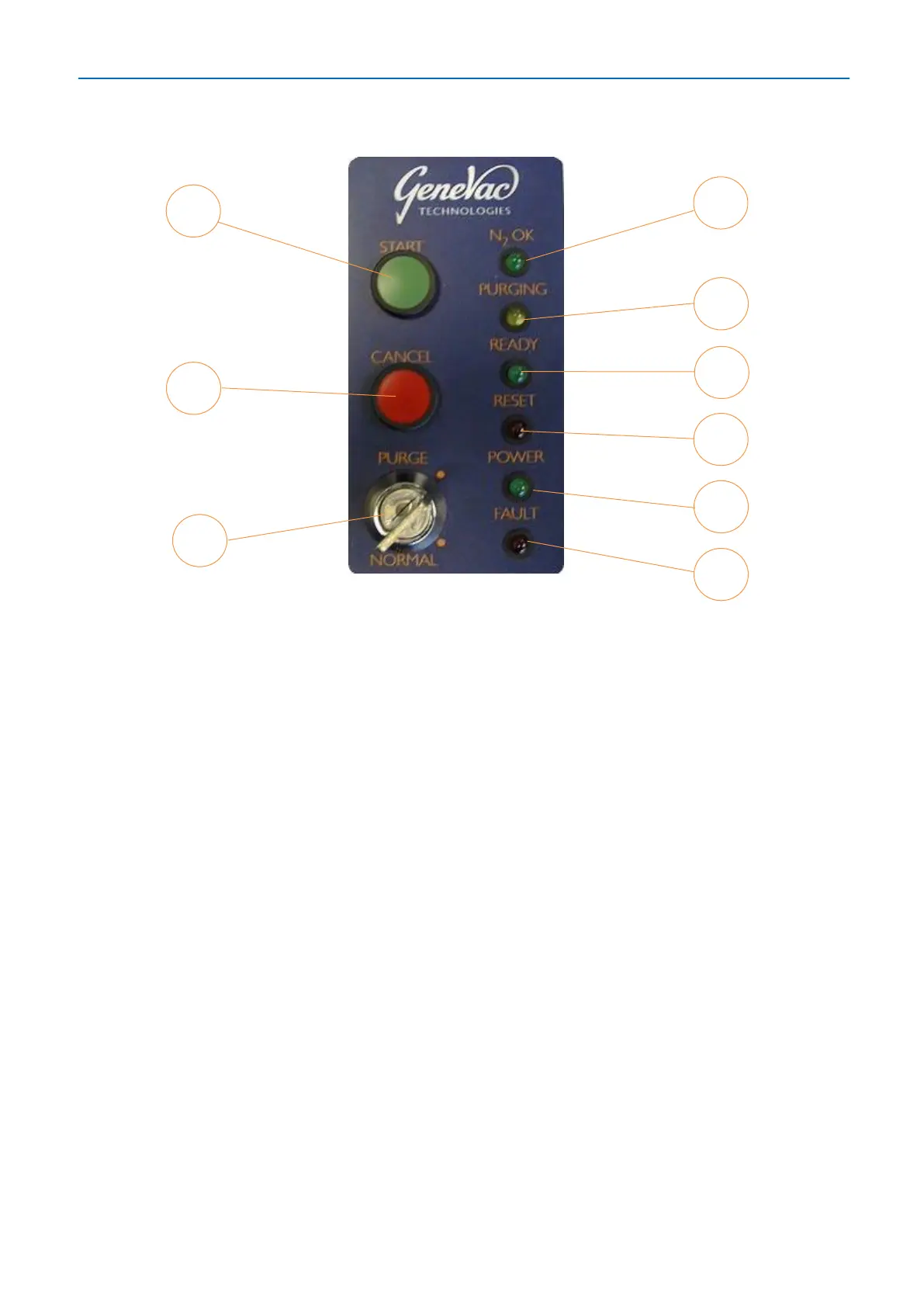 2. CANCEL button: Press to reset the inert gas purge system (once the cancel button