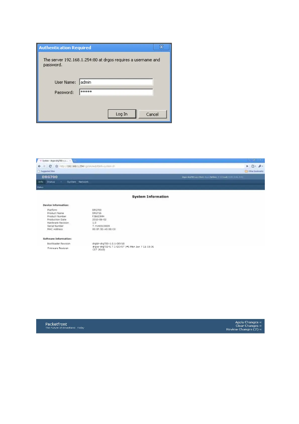 2. Login using with the User Name admin and the Password admin. The DRG700 configuration