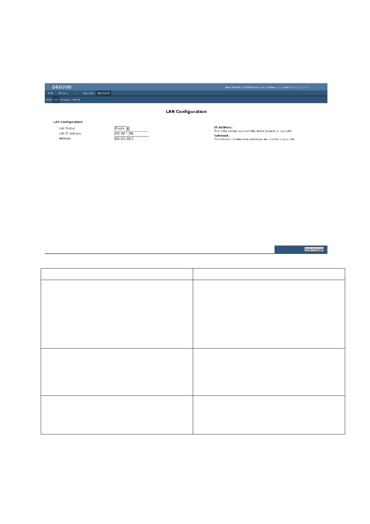 LAN status If Enabled, the DRG700 will allocate IP Addresses to PCs