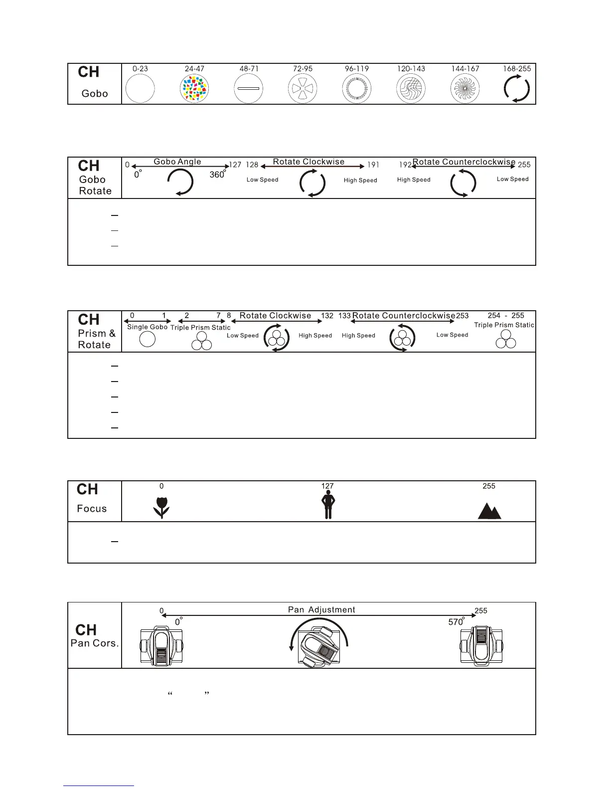 Rotating gobo angle zero to 360 degrees. adjustment from