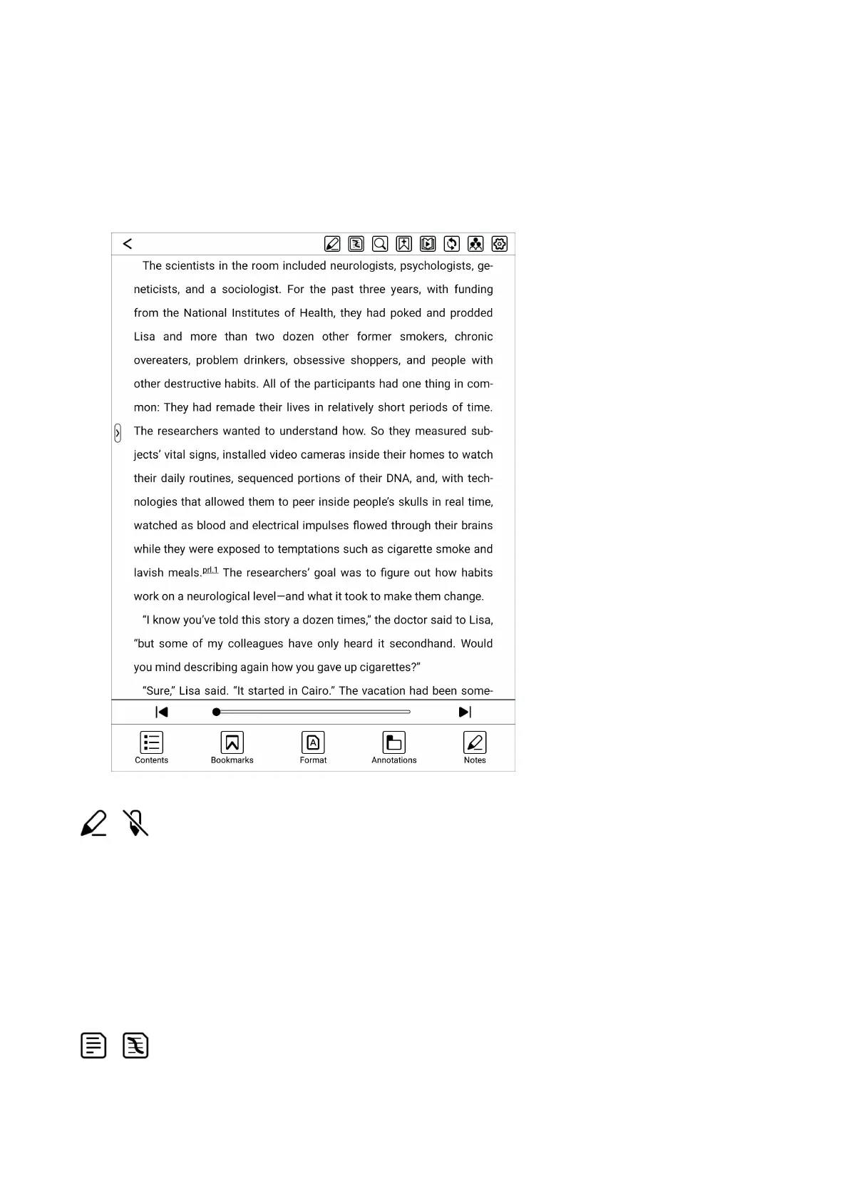 chapter, contents, bookmarks, format/display, annotations and notes.
