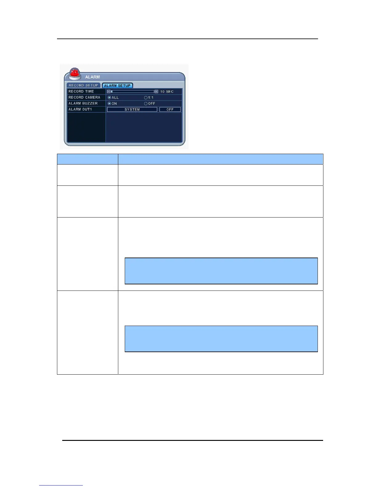 duration of the RECORD TIME. This buzzer relates to Alarm Out.