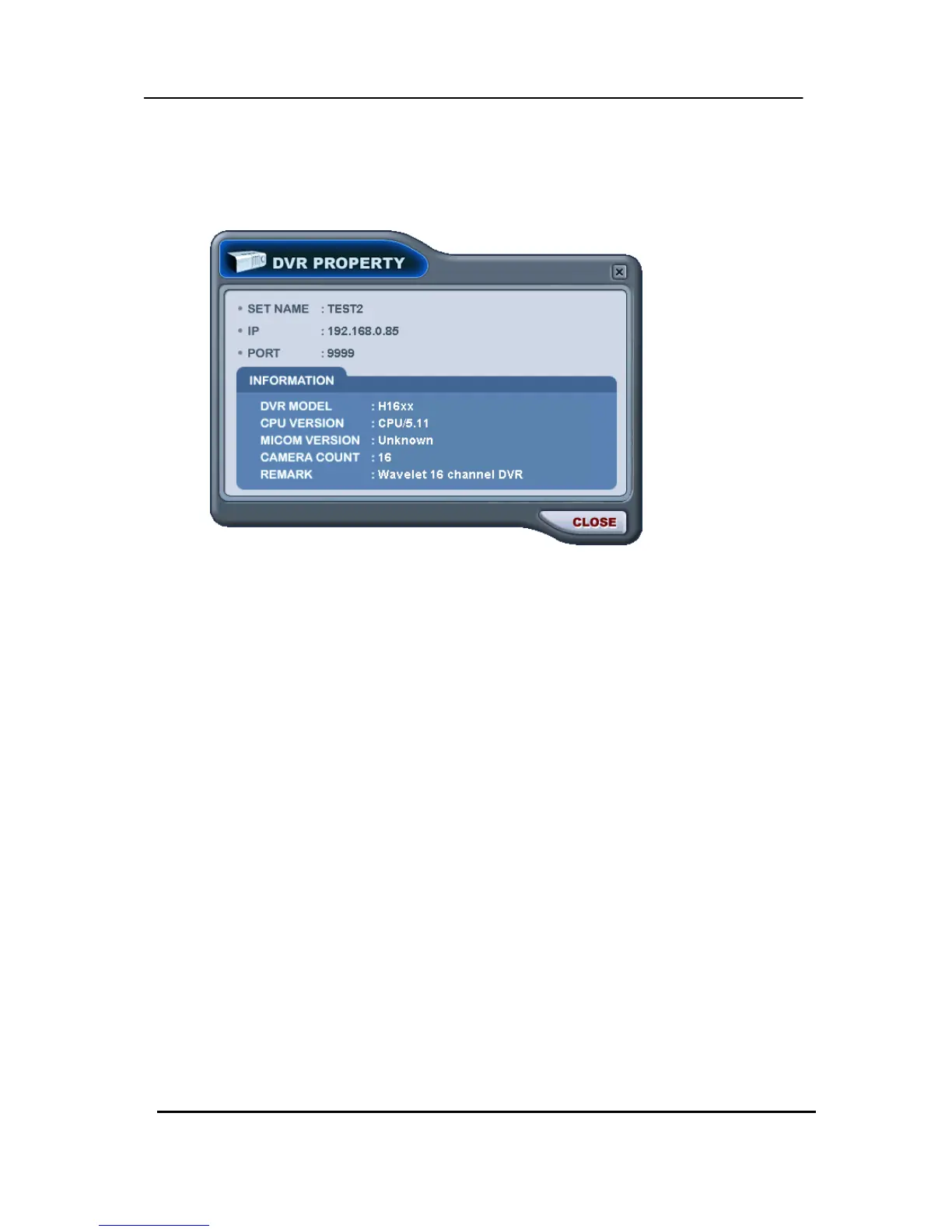 (5) PROPERTY: This menu provides information such as DVR Name, IP number & port,