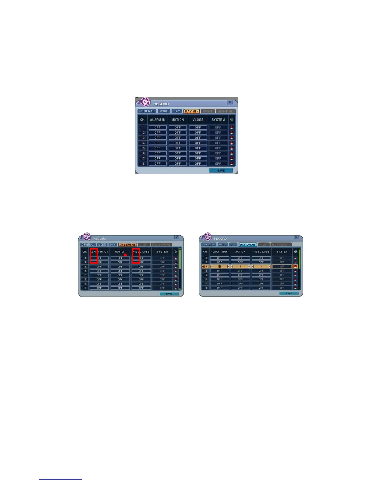 Select Alarm, Motion, Video Loss for EVENT recording on the DAY EVENT tab.