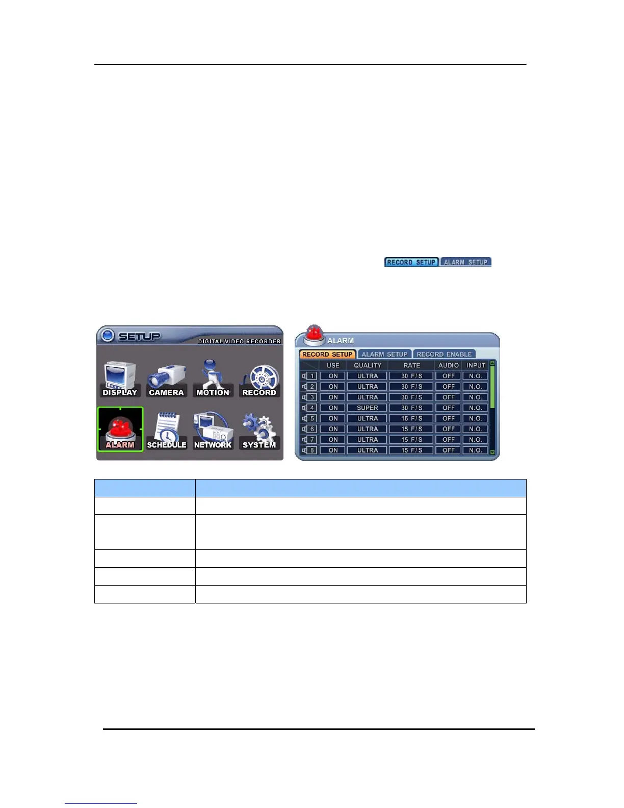 RATE y Select recording rate of each camera when Alarm is triggered
