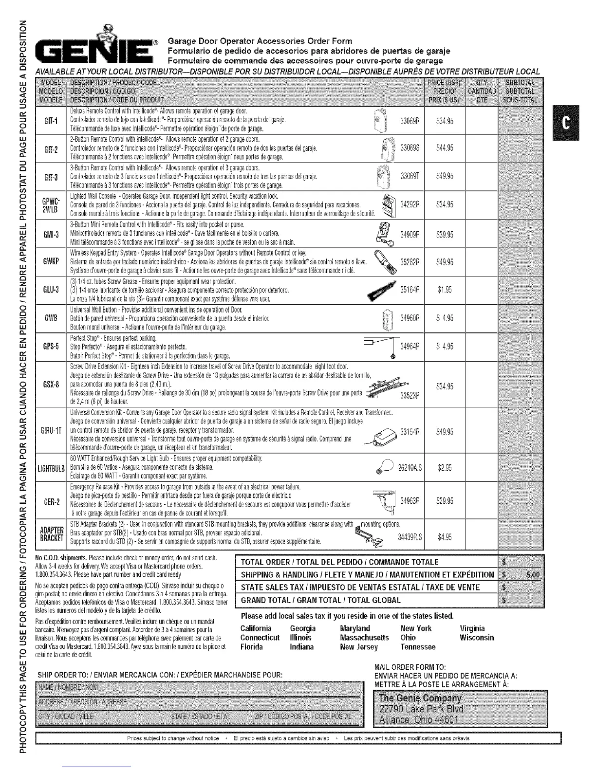 Garage Door Operator Accessories Order Form