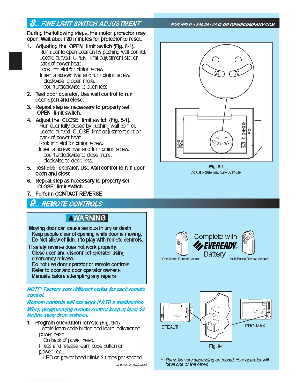 Genie Pro Stealth - Fine Limit Switch Adjustment; Motor Protector During Limit Adjustments; Fine-Tuning Open Limit Switch; Fine-Tuning Close Limit Switch
