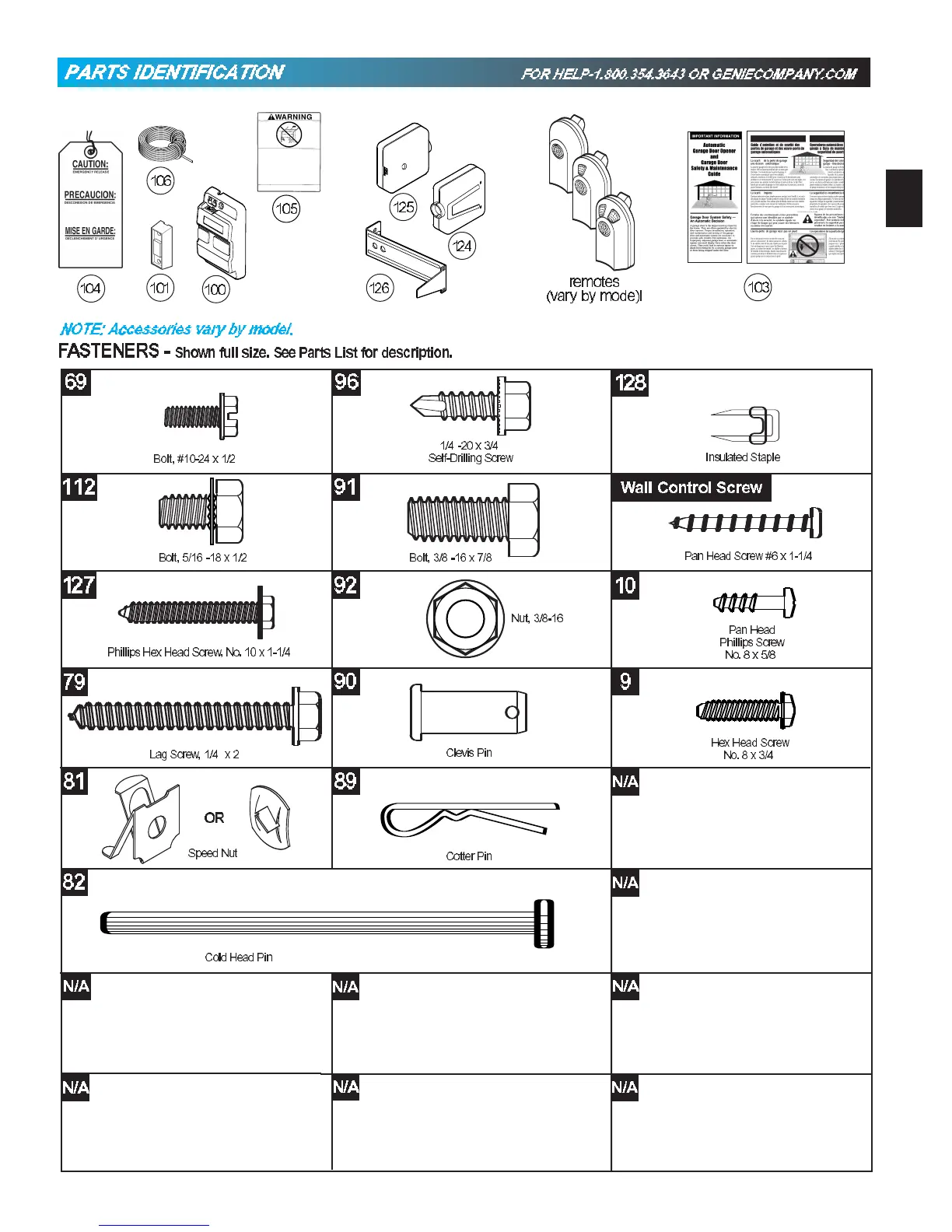 Genie Pro Stealth - Parts Identification; Fastener Identification; Remote and Wall Control Identification