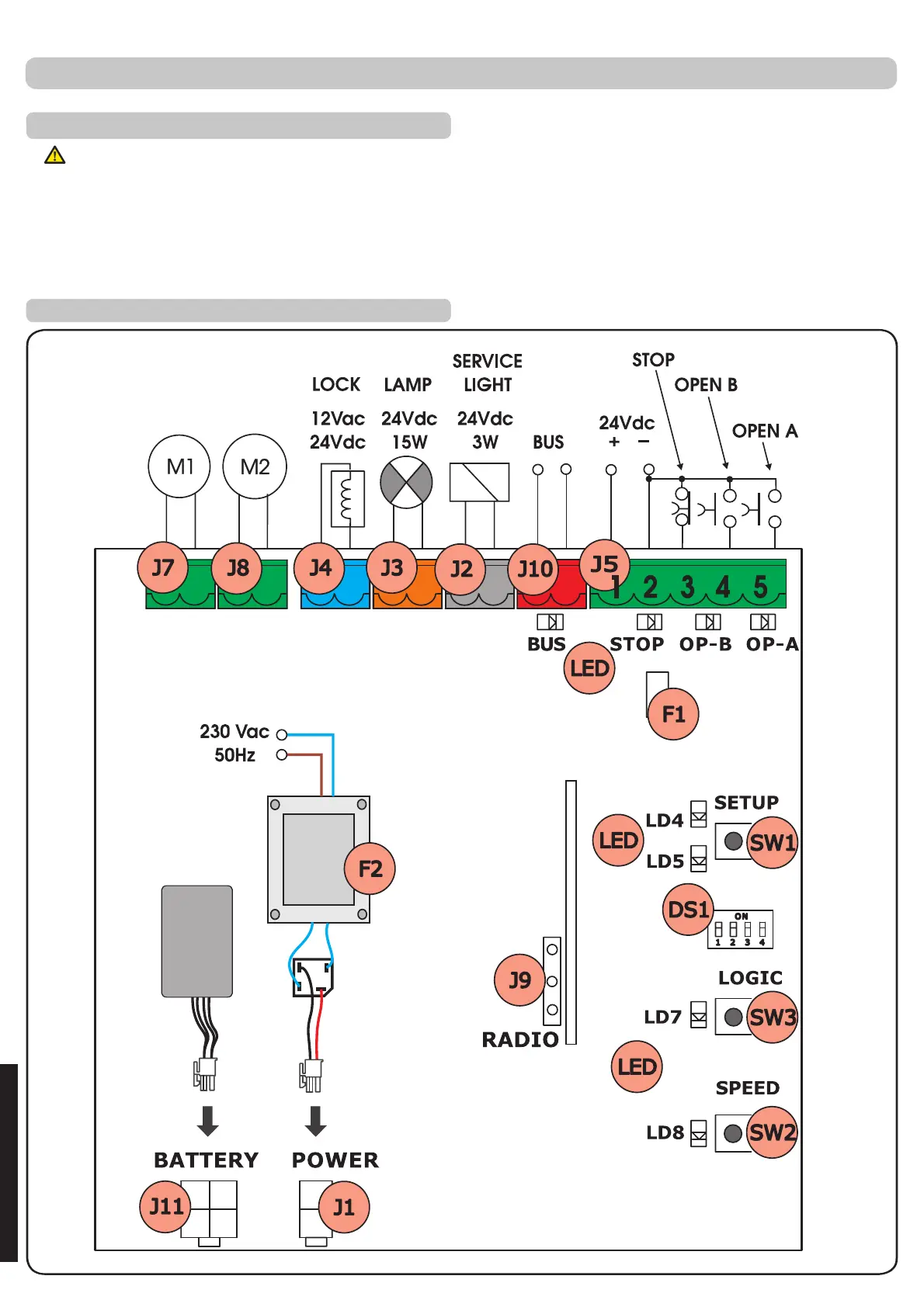 - Houd de voedingskabels altijd gescheiden van de kabels voor de bediening en de beveiliging (drukknop, ontvanger,