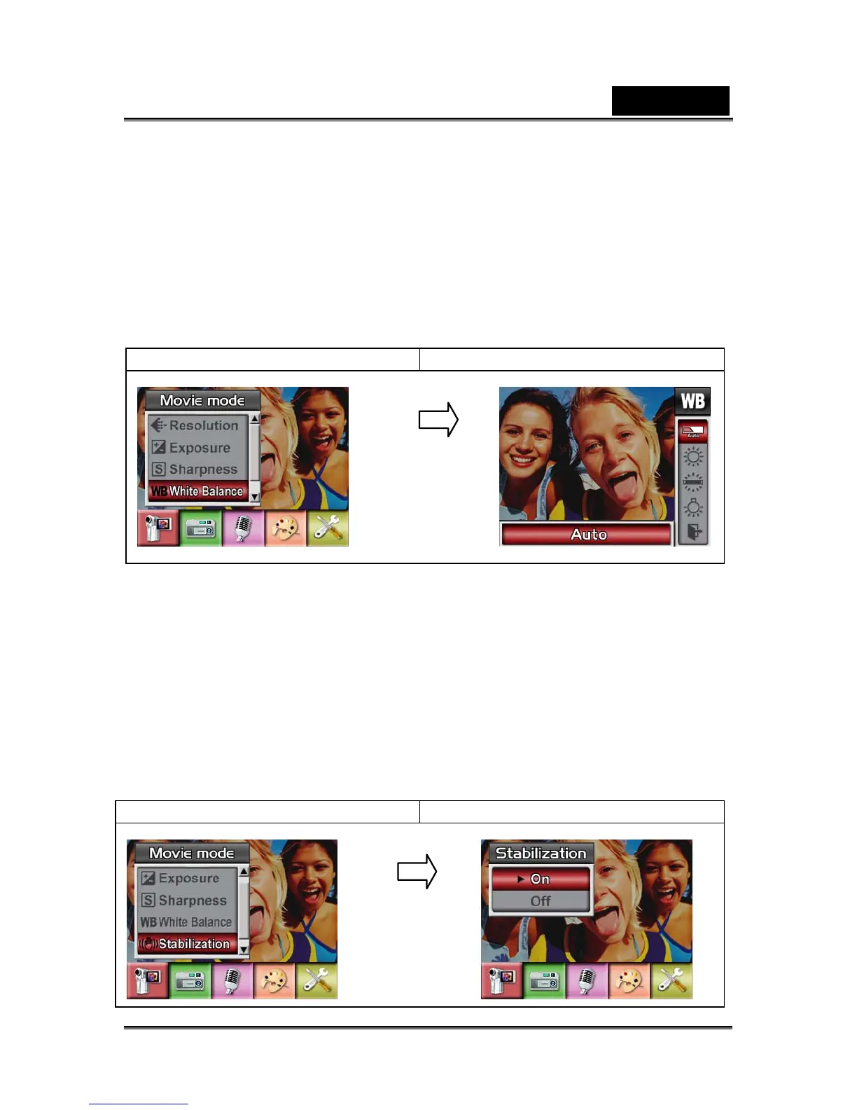 3. Use Up/Down Buttons to select Motion Stabilization then press Enter Button to