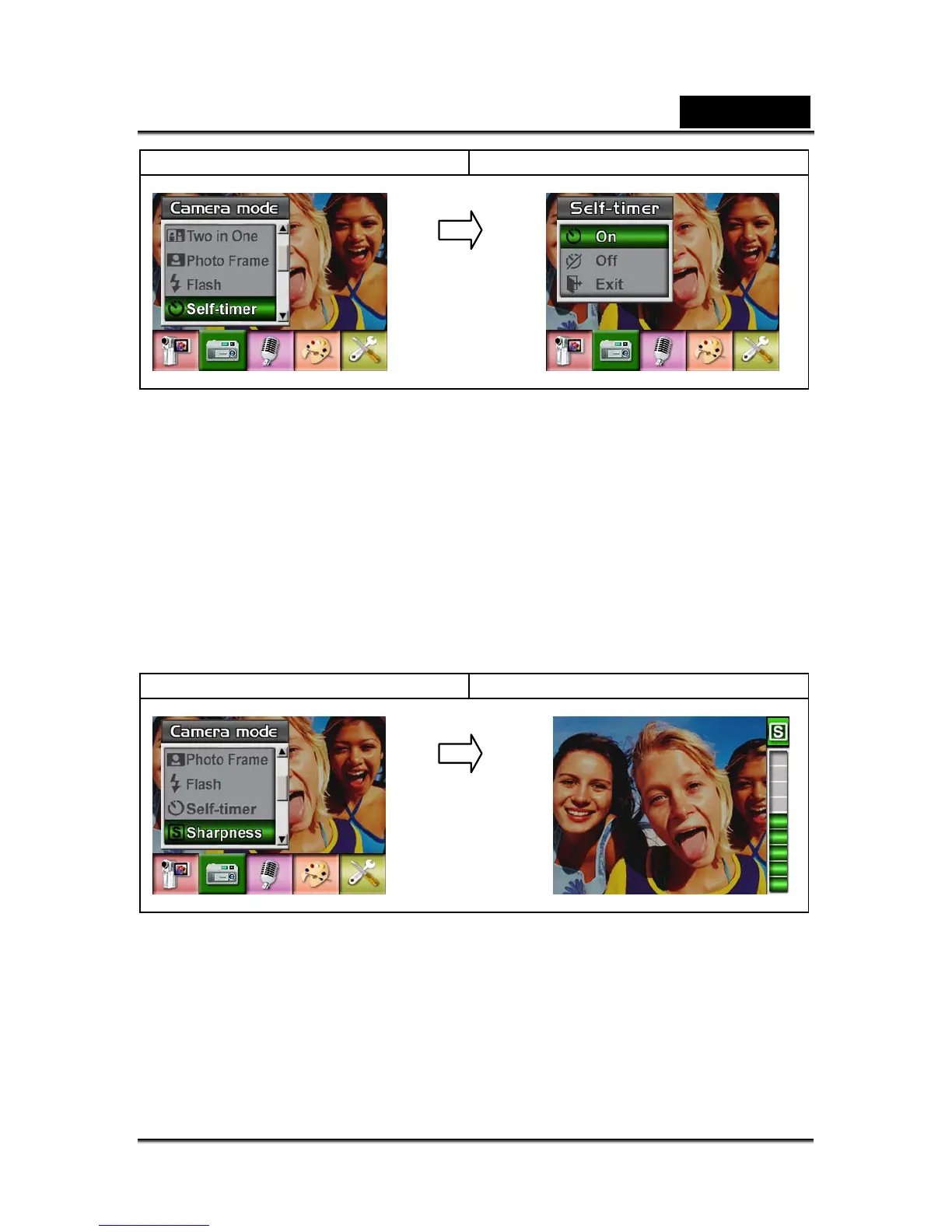 1. When in Camera Mode, use Up/Down Buttons to select Sharpness Option, then