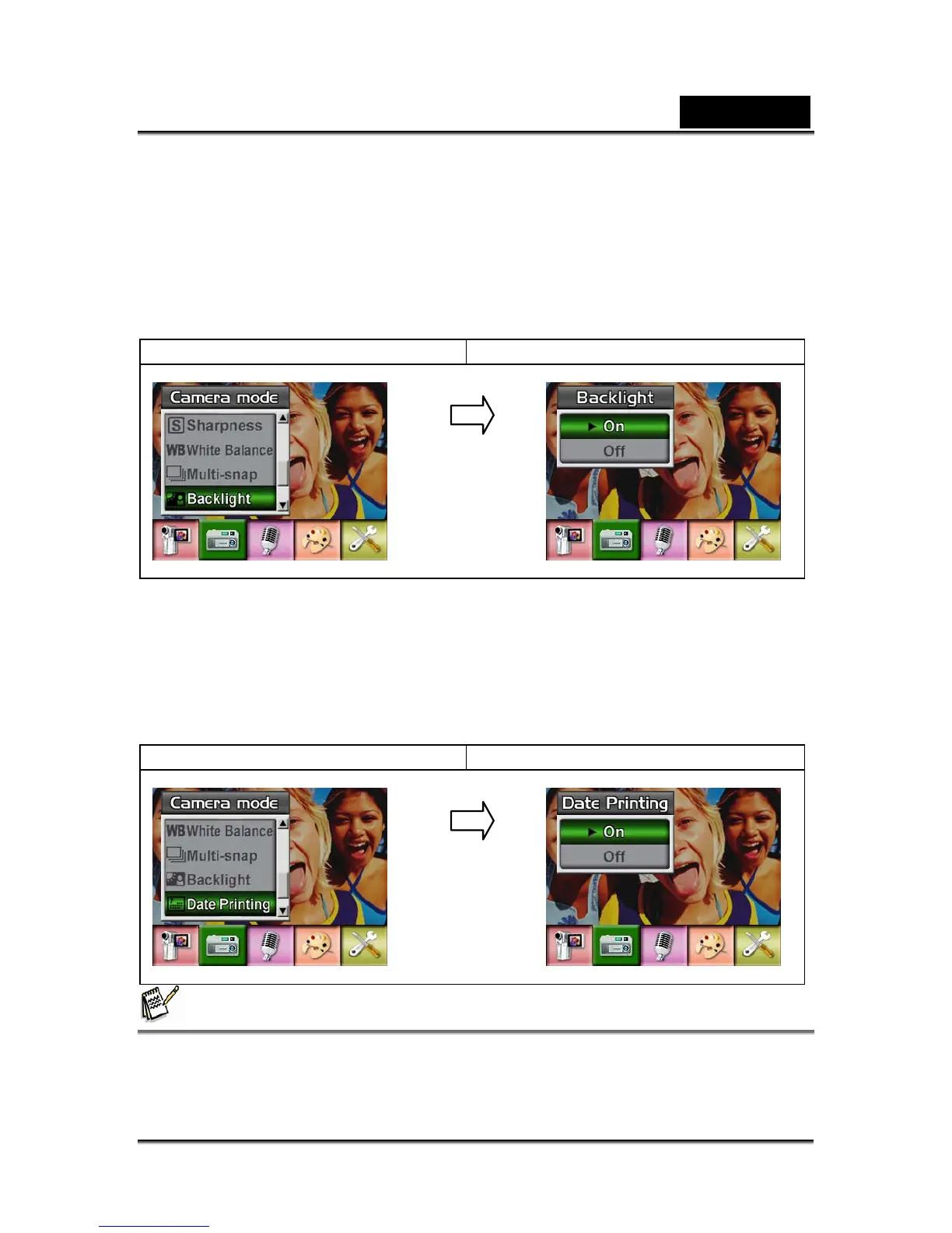 1. When in Camera Mode, use Up/Down Buttons to select Backlight, then press