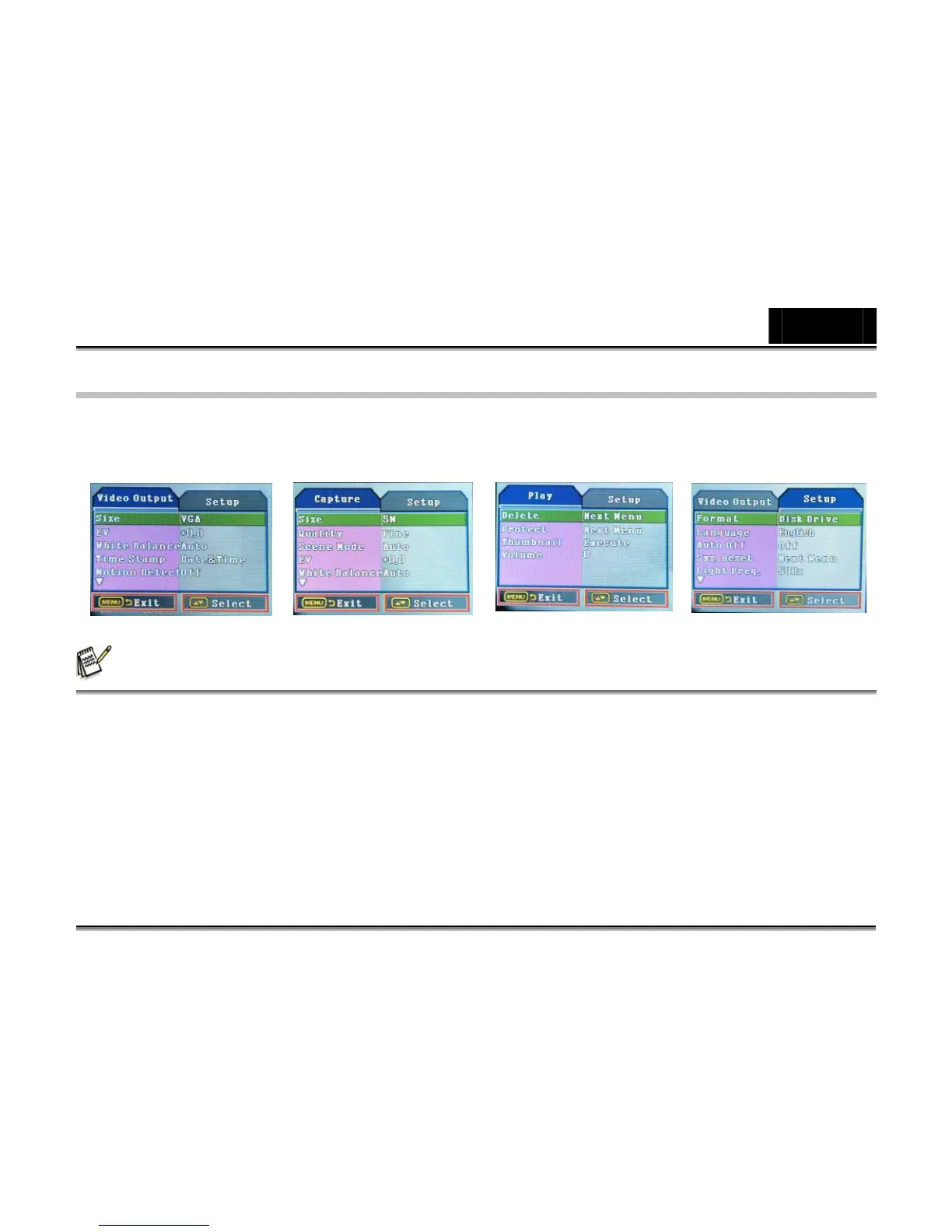 1. メニューボタンを押して、ビデ / カメラ / 再生 / セットアップメニューの機能を選択します。