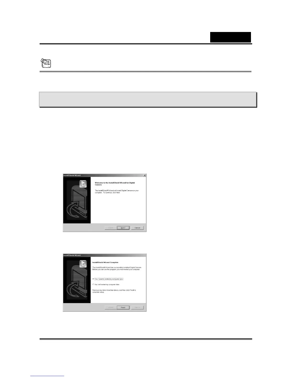 can use the PC Camera and Mass Storage functions of the camera via PC. To install
