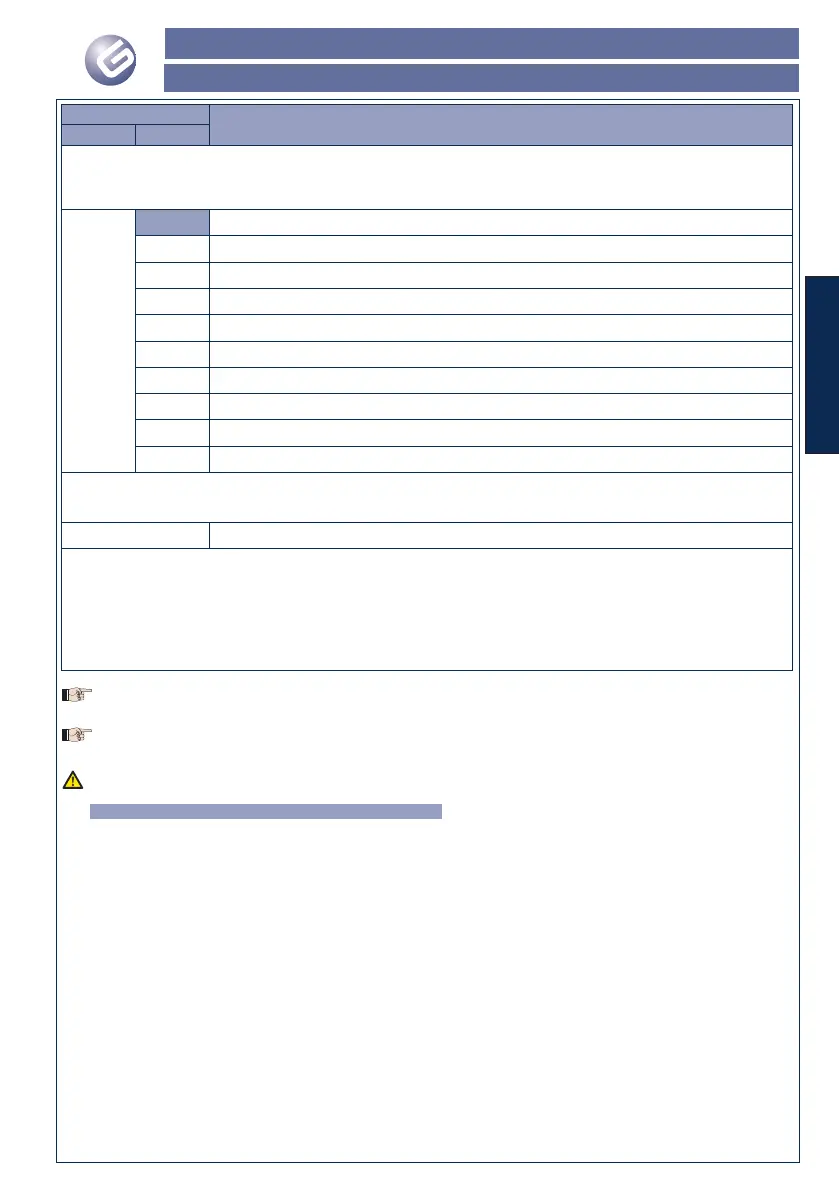 The conditions shown on the table refer to default values of the control unit. We recommend you to make a note of the