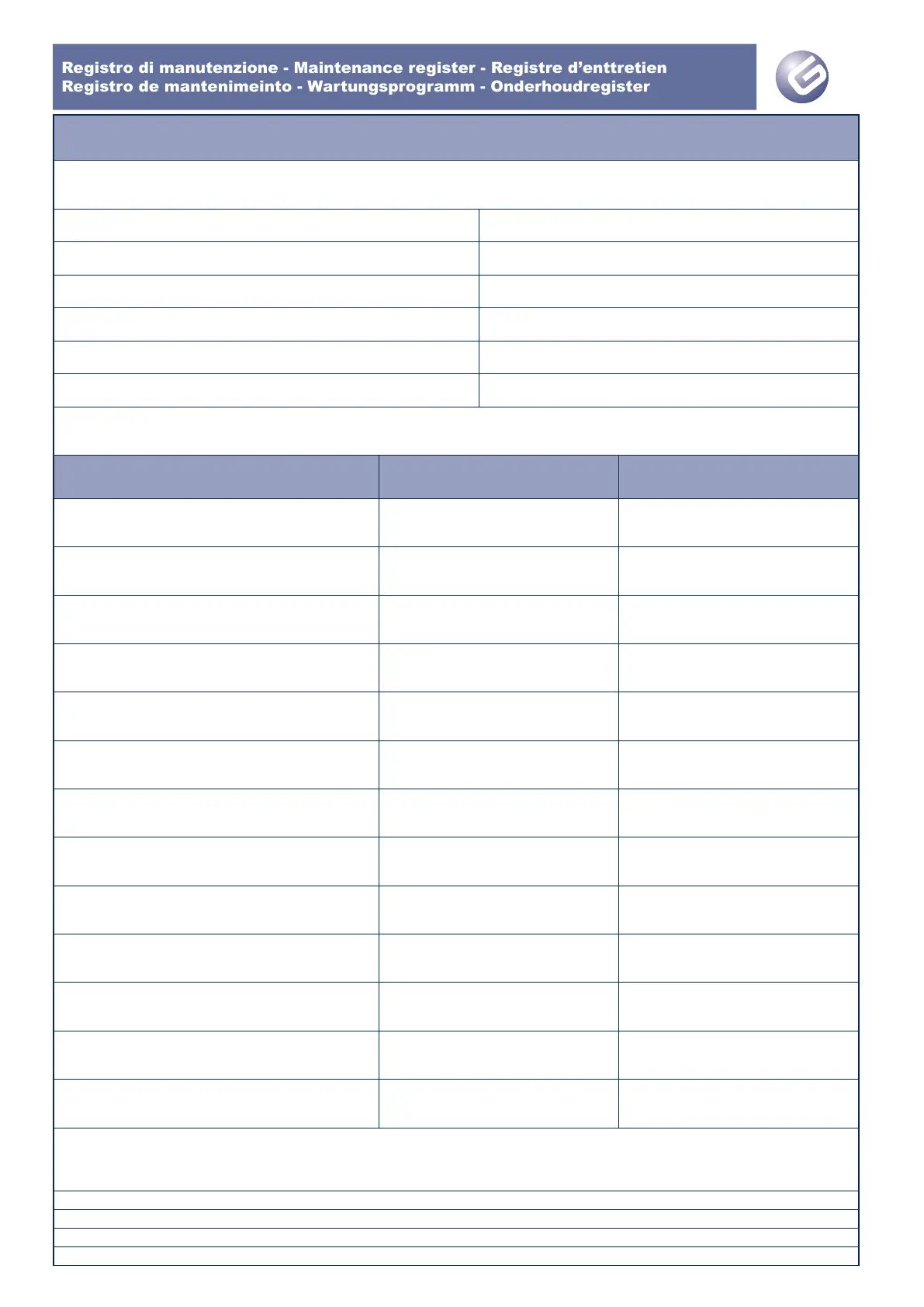Registro di manutenzione - Maintenance register - Registre d’enttretien