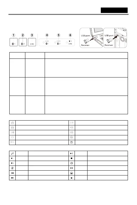 BT1 / BT2 / 2.4GHz Chuyển đổi và ghép nối chế độ bàn phím: