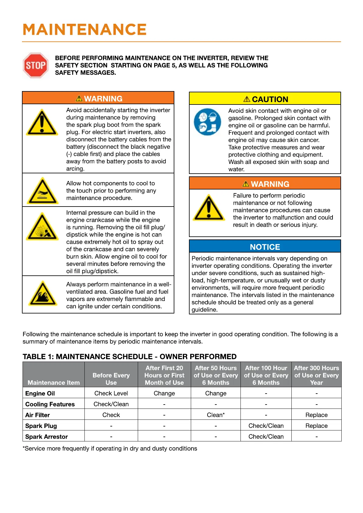 GENMAX GM2000i - MAINTENANCE; Maintenance Schedule and Precautions