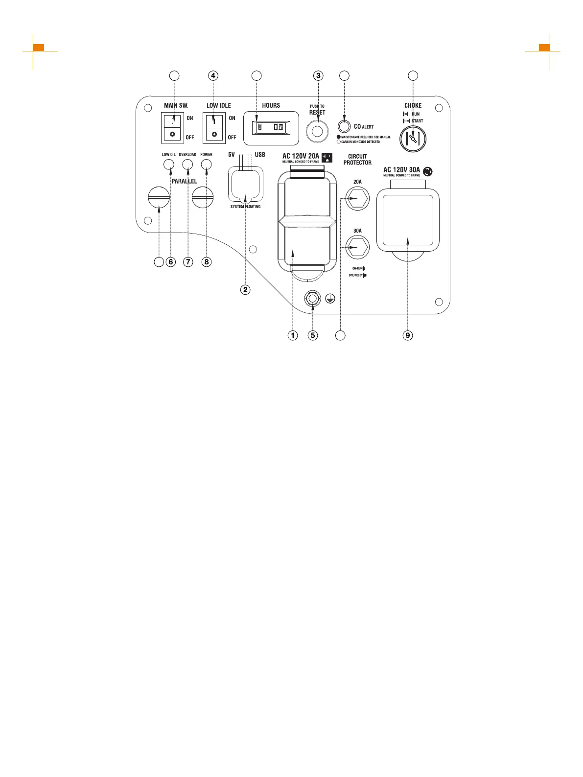 ⑥ Low Oil Alarm: Indicates low oil level.