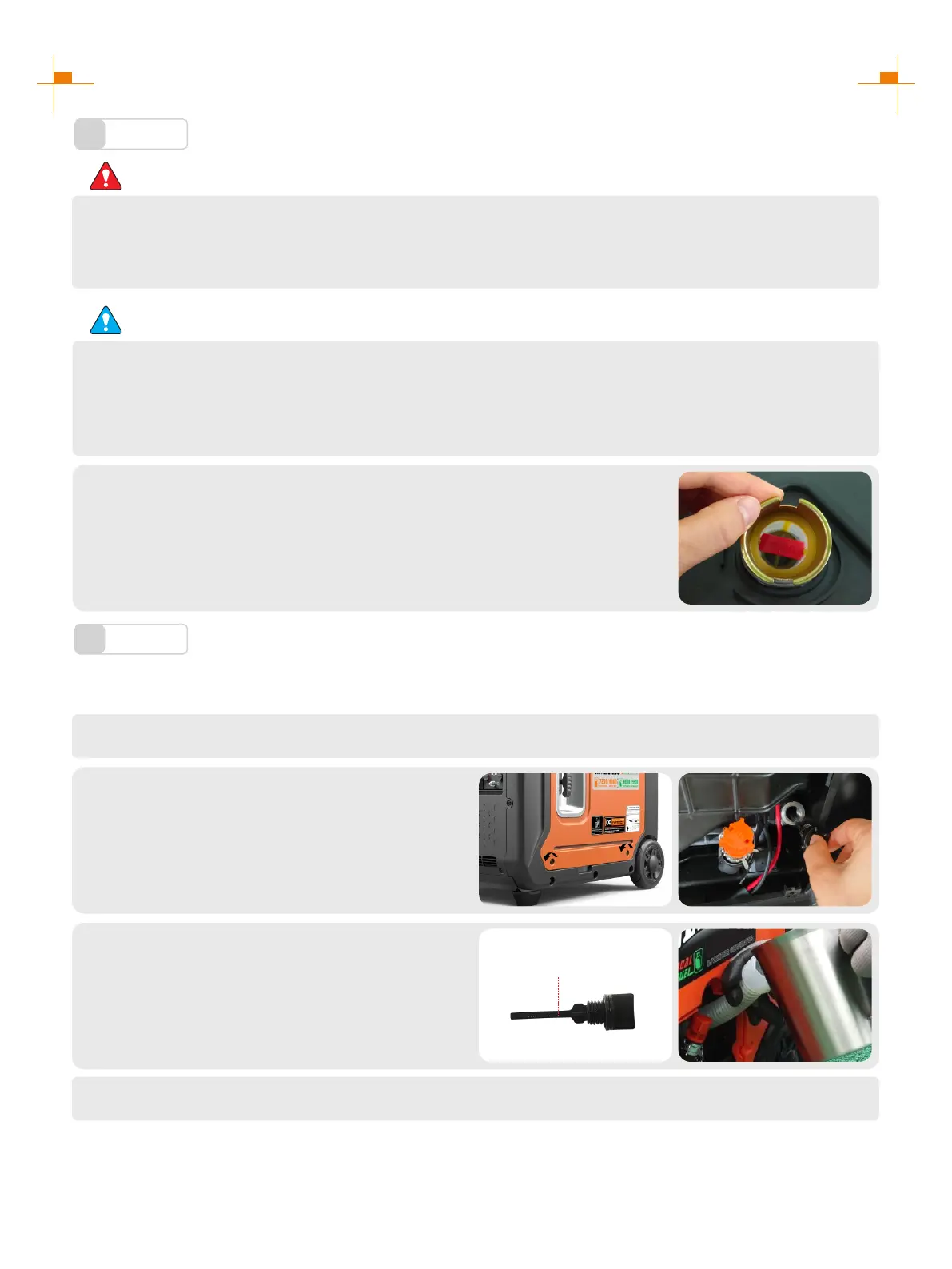 No oil is filled into this generator when being delivered. Do not start up the generator without filling sufficient