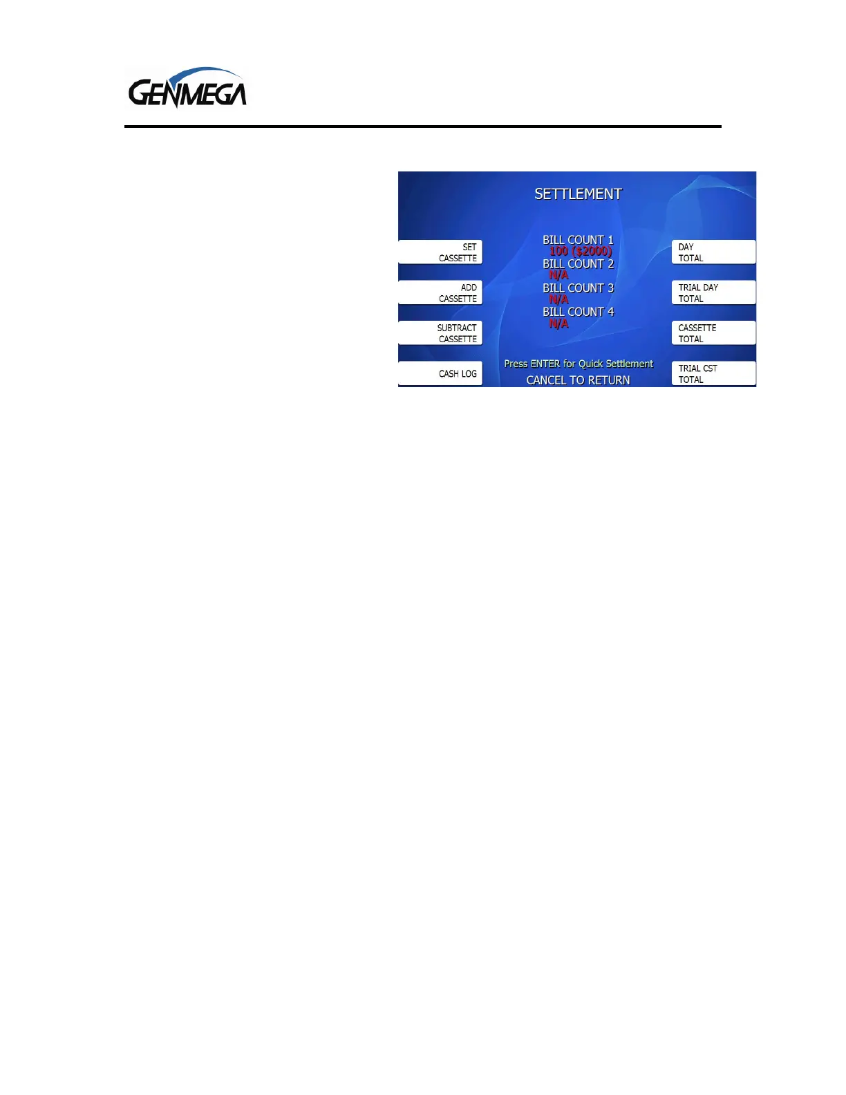SETTLEMENT MENU – ADDING CASH