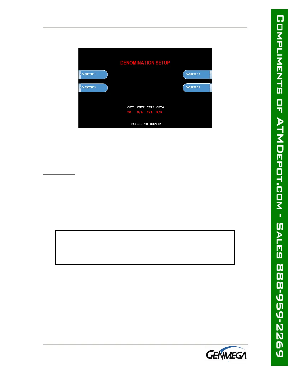 The Denomination is the type of bill that each cassette will be dispensing. The ATM