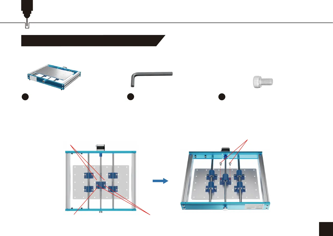 2.アルミニウム製プラットフォームを動かしてリードスクリューホルダーのネジ穴を合わせ、M6×10mm六角穴付きボ