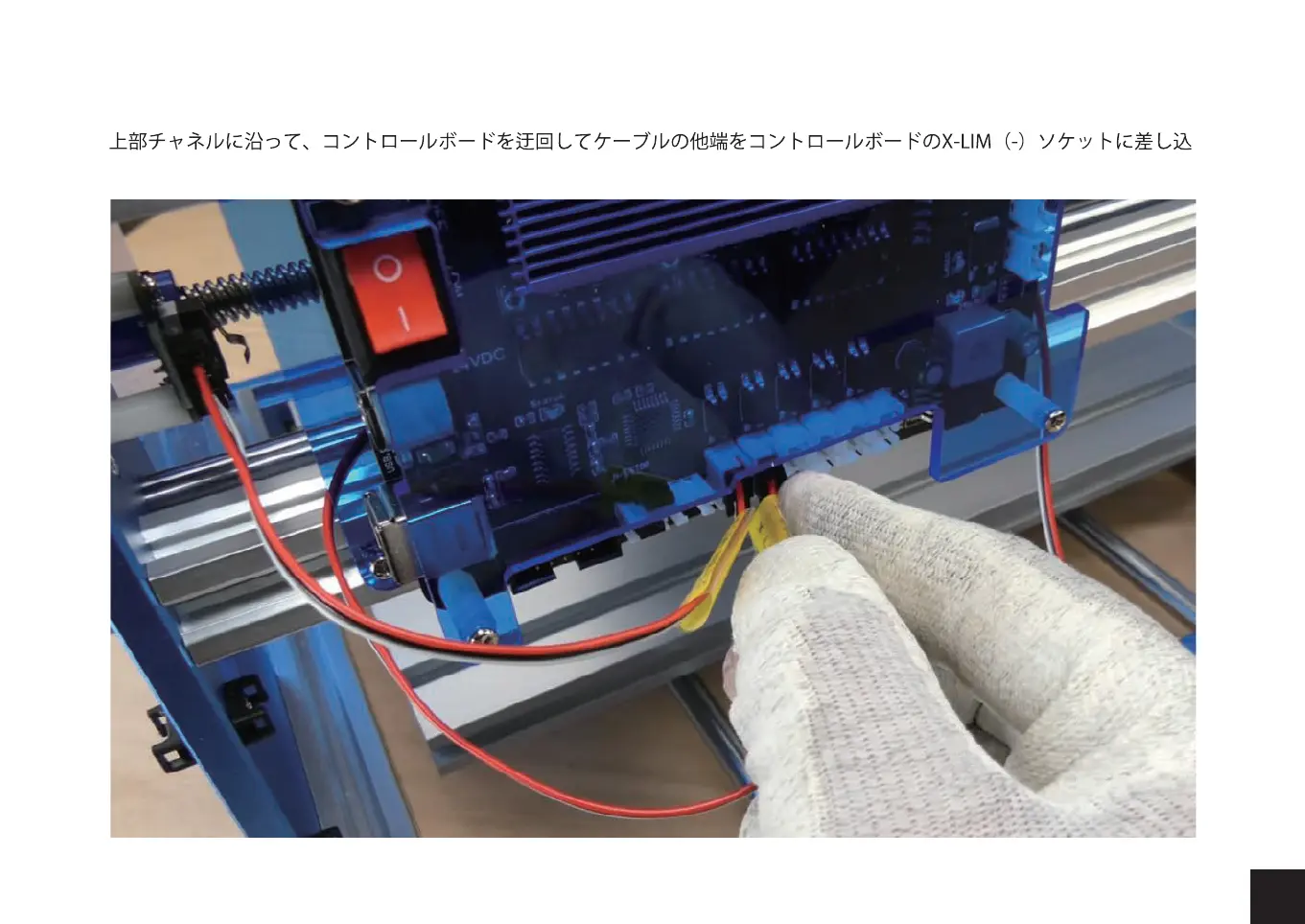 ステップ2:リミットスイッチケーブルX-LIM(-)を右側のX-リミットスイッチに接続します。X-軸/Z-軸ガントリーのビーム