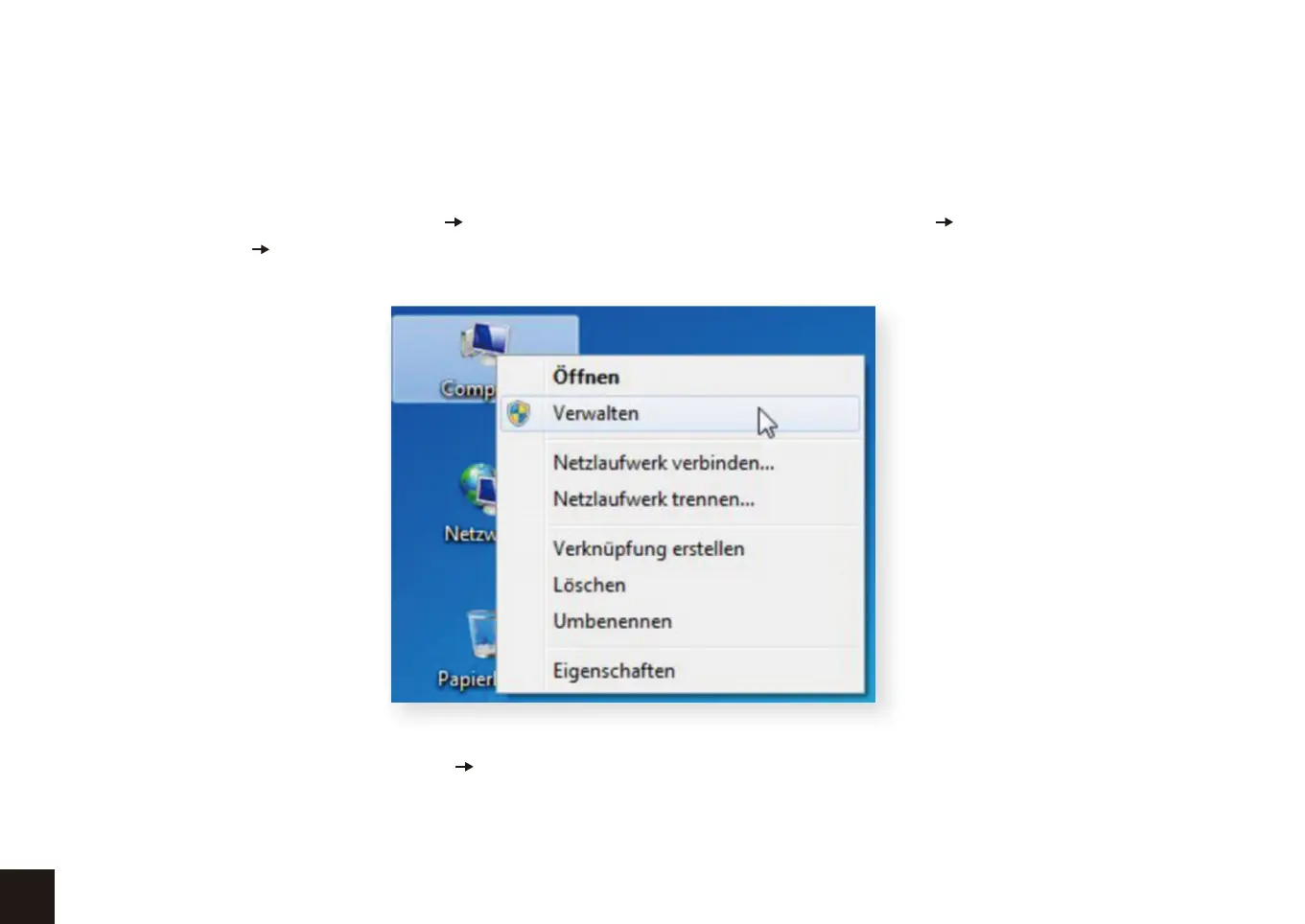 · Windows 7: Klicken Sie auf „Start“ Klicken Sie mit der rechten Maustaste auf „Computer“ Wählen Sie „Verwalten“