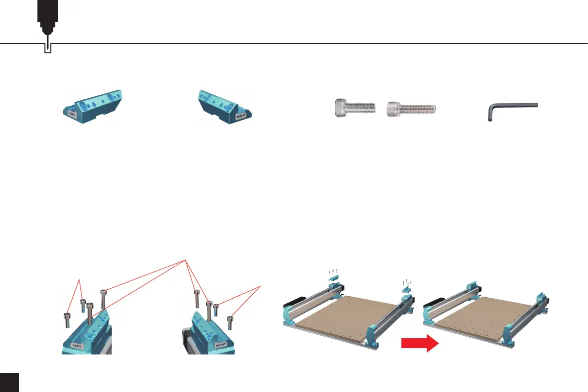 3. Verwenden Sie (4) M5x14mm- und (4) M5x22mm-Schrauben, um die Stützblöcke an den Y-Achsen-Schiebern zu befestigen, und