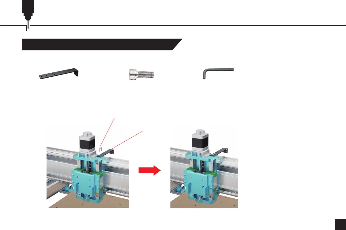 シートメタルケーブルホルダーの穴に(2)M3x8mmを通し、ケーブルホルダーを青いケーブルレールマウントに固定し、ネジを