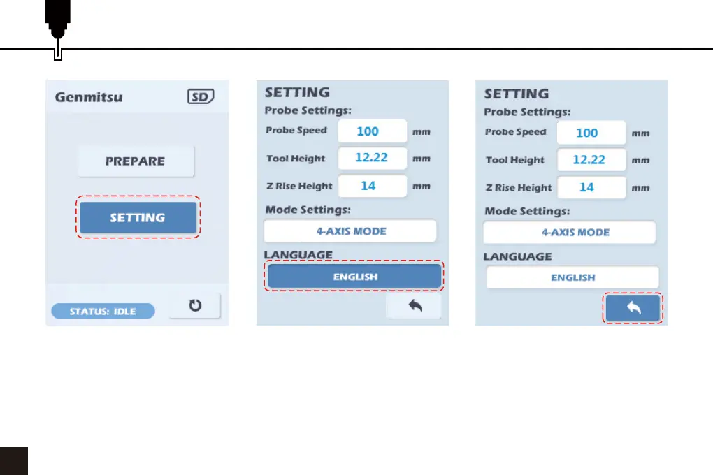 2. Press the dial to select the displayed language, this will not take effect until the Back Icon is selected and the
