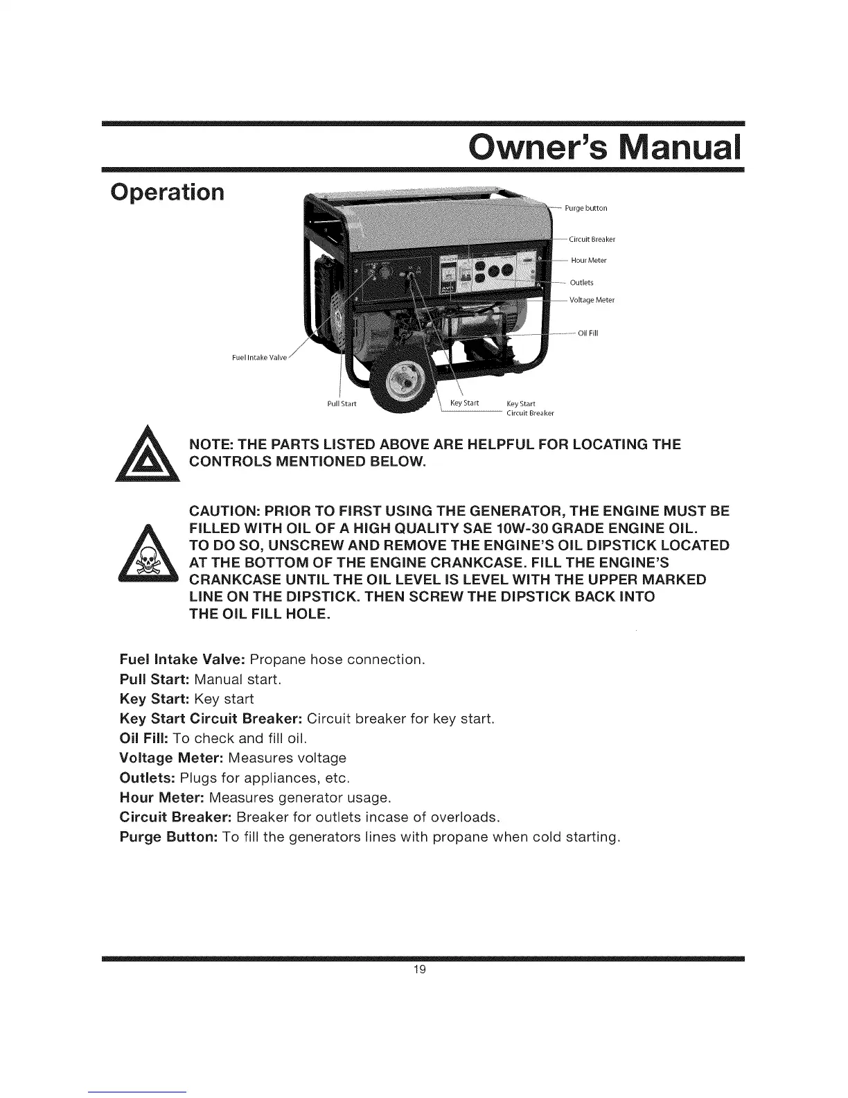 Purge Button: To fill the generators lines with propane when cold starting.