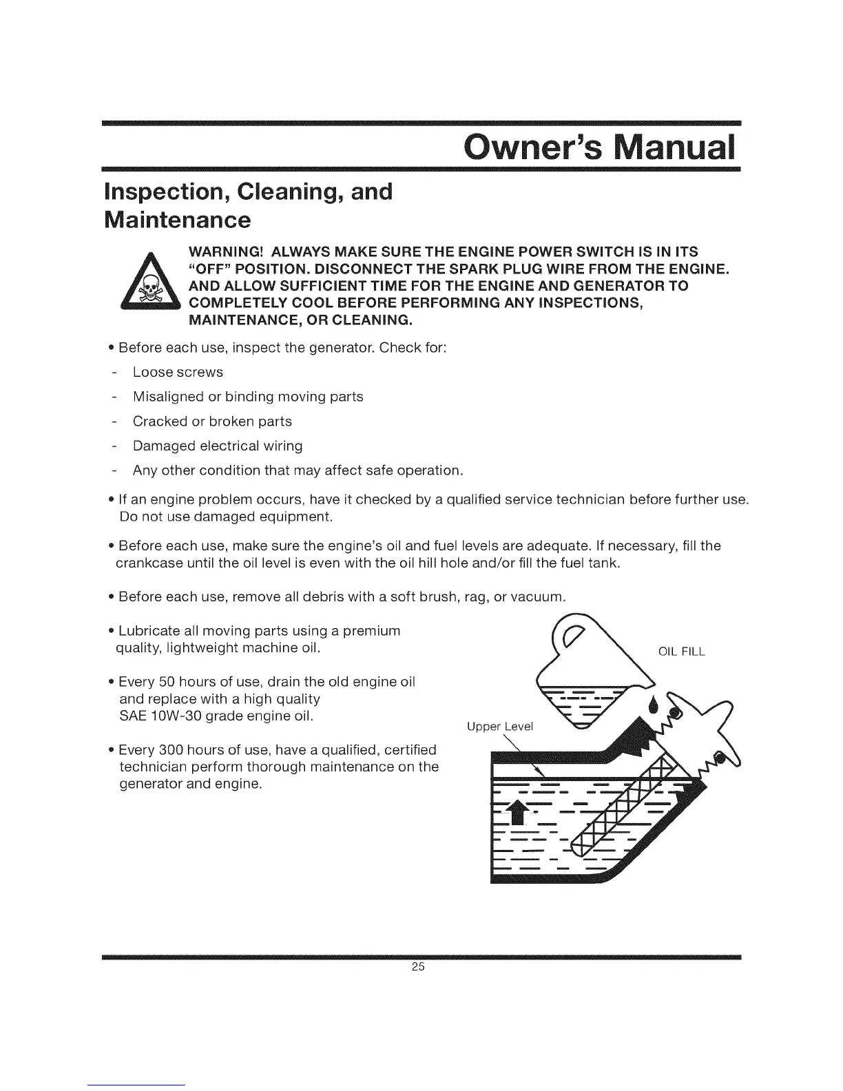 Before each use, make sure the engine's oil and fuel levels are adequate. If necessary, fill the