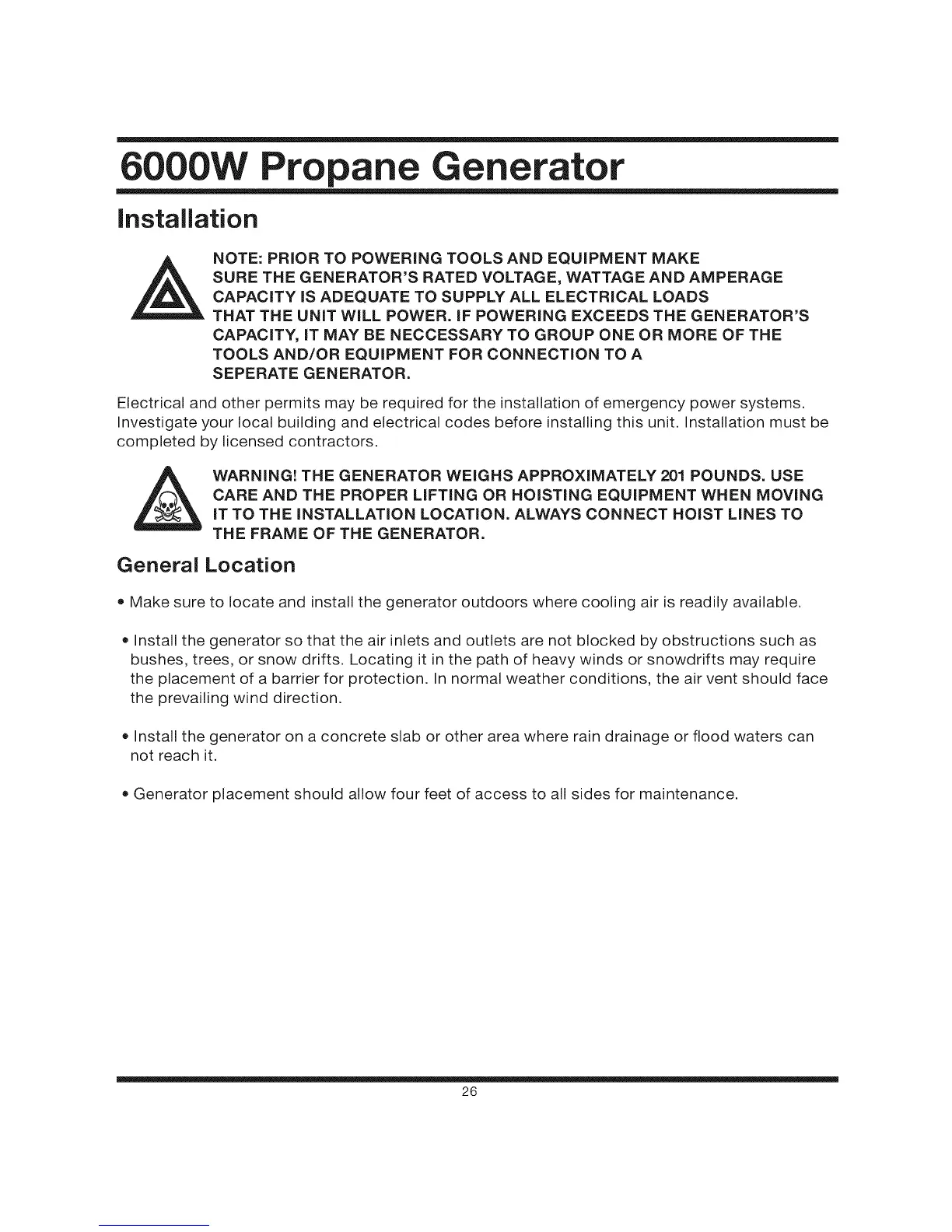 WARNING! THE GENERATOR WEIGHS APPROXIMATELY 201 POUNDS. USE