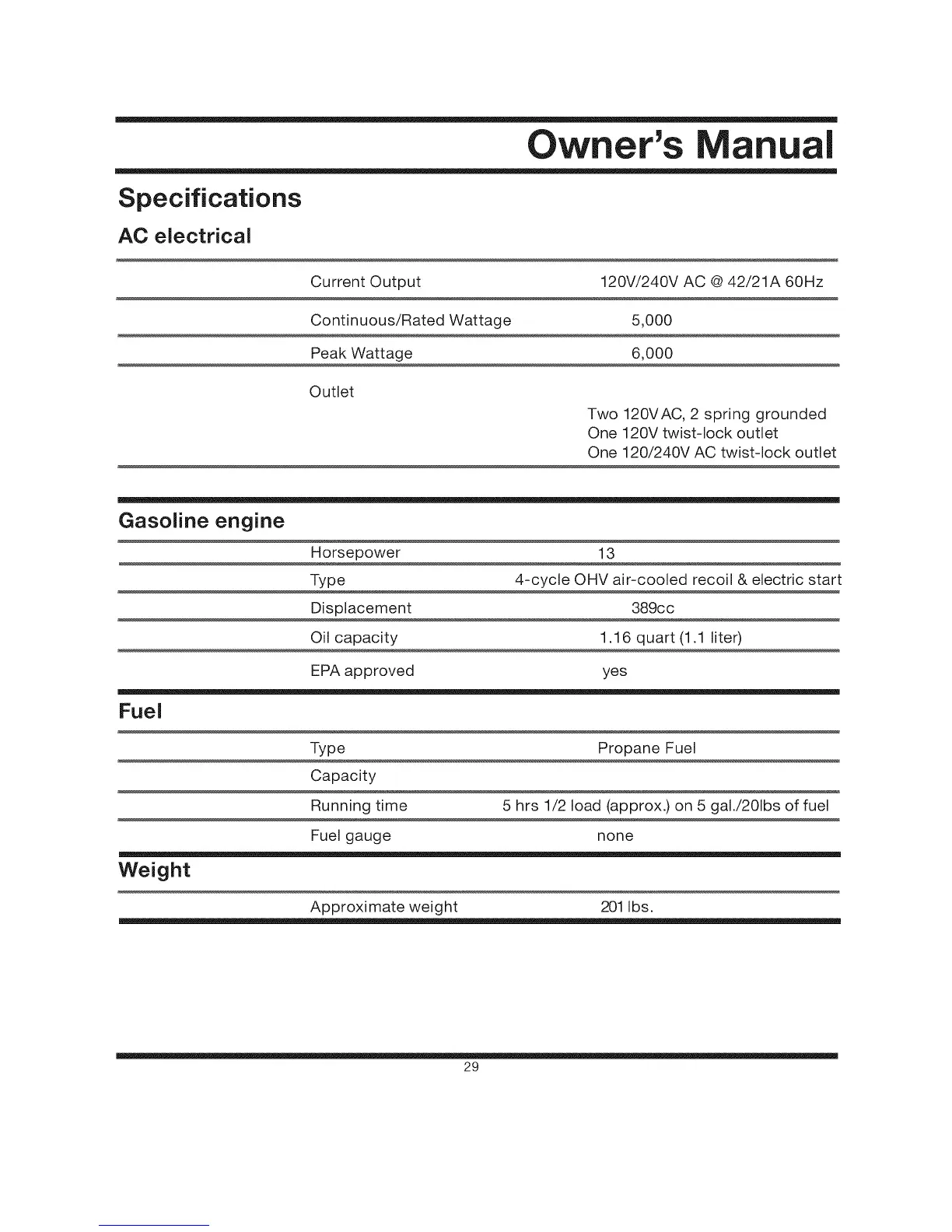 Running time 5 hrs 1/2 load (approx.) on 5 gal./201bs of fuel