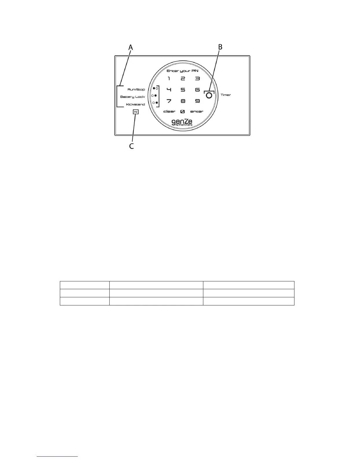 The Run/Stop Switch, battery lock, and kickstand (A) each have two indicator lights. In order for you to operate your