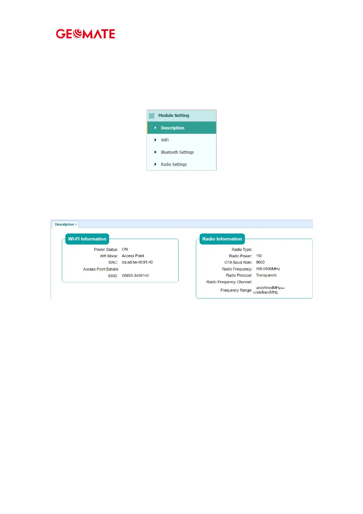 Use this menu to check module information, configure WiFi, bluetooth, radio related settings,