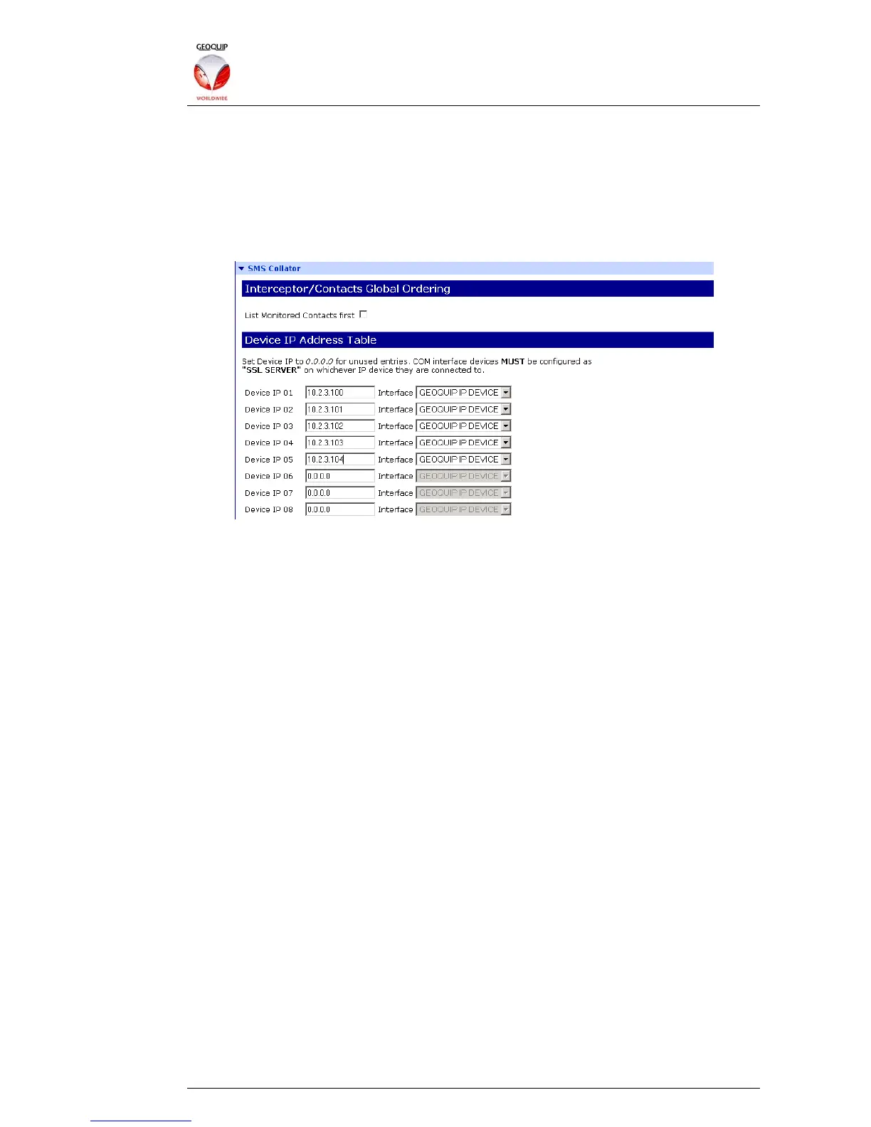 Interface option set to Geoquip IP Device: