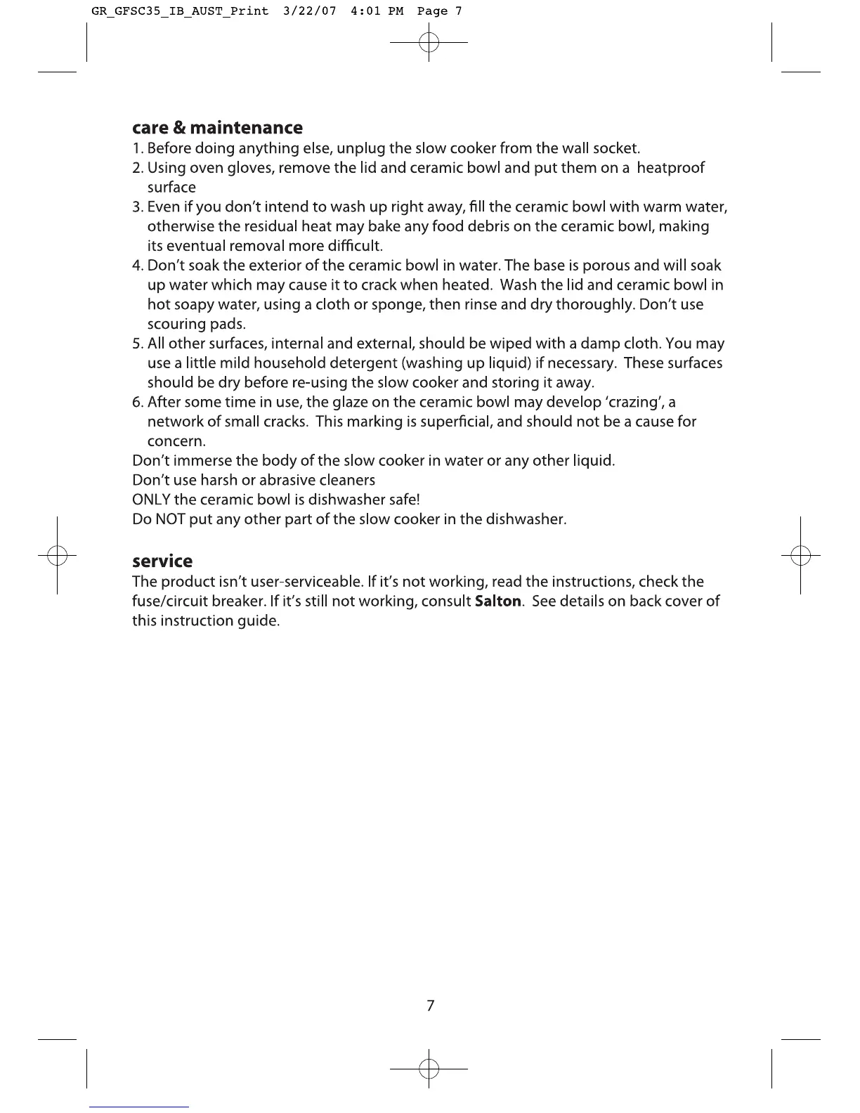 George Foreman GFSC35 - Maintenance and Service; Cleaning and Care Instructions; Troubleshooting and Product Service