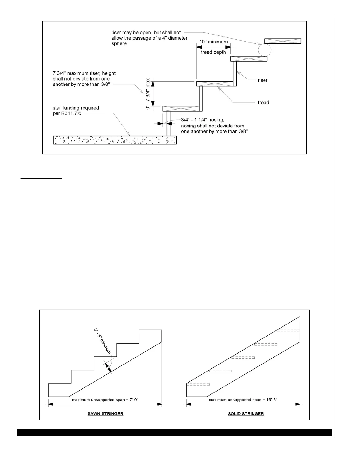 • Stringers shall be continuous sawn or solid 2x12s meeting the stair geometry requirements shown