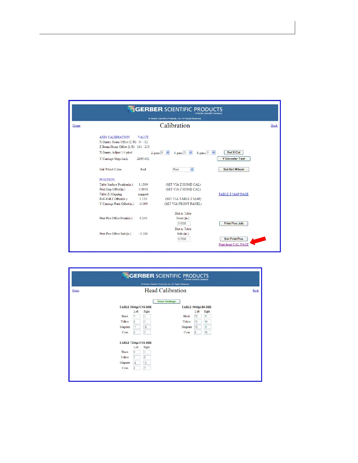 5 Click the Print head CAL PAGE button to open the Head Calibration web page.
