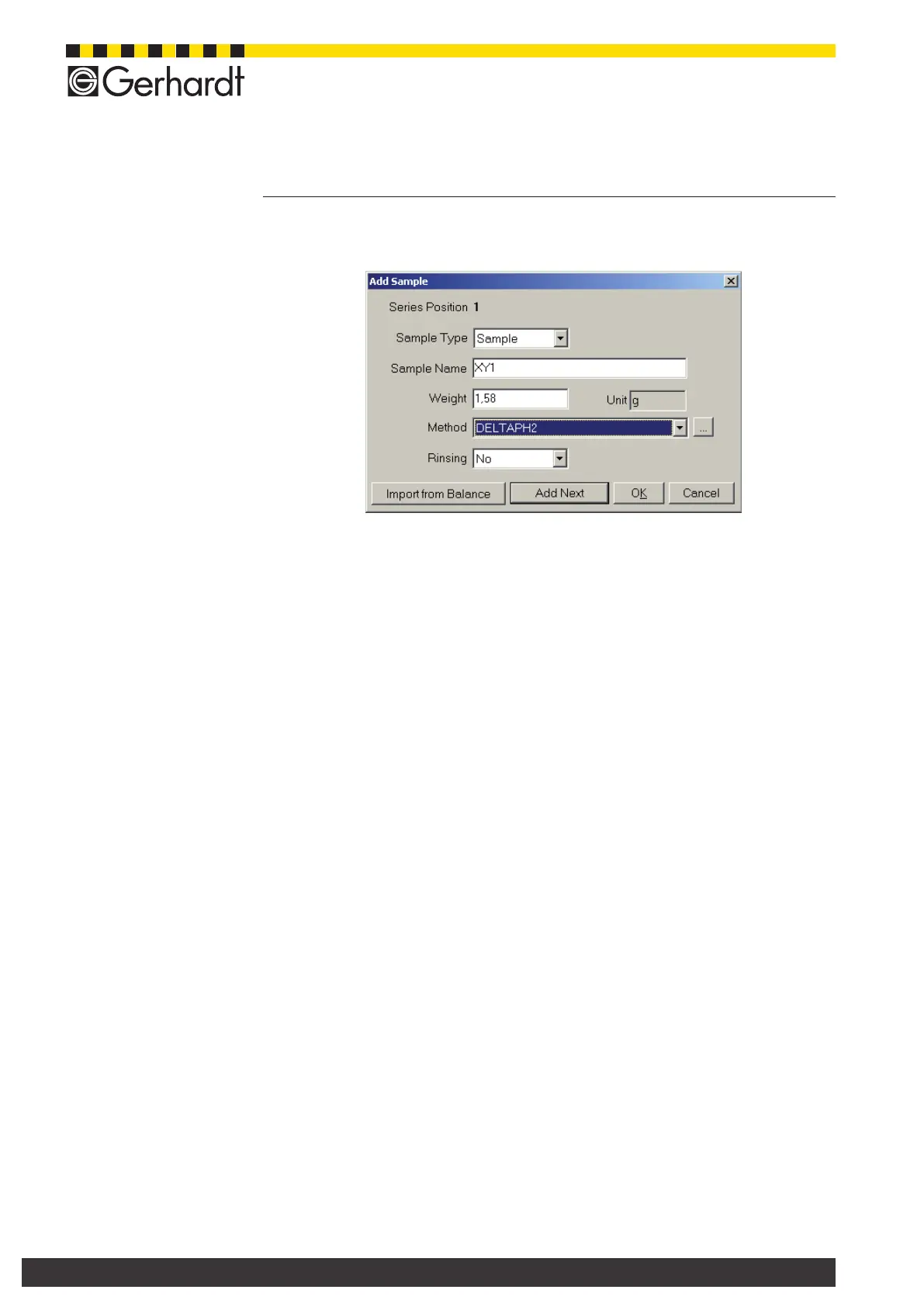 Enter the weight/volume of the sample here or press key „ImportBalance" to