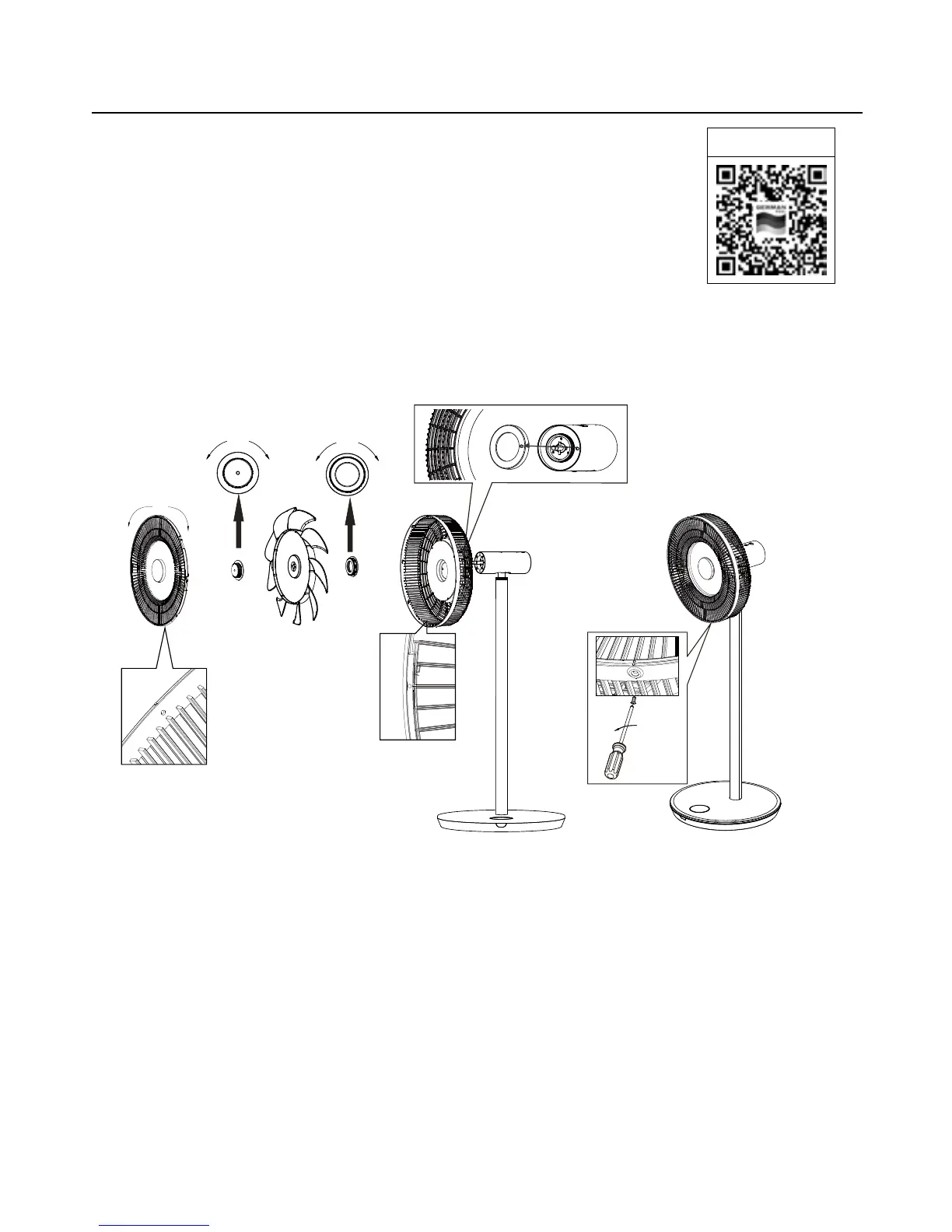 2. 使用螺絲批拆開風扇前、後保護網和扇葉。前保護網可順時針擰緊,逆時